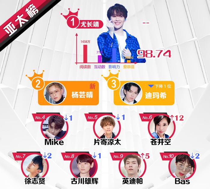 Ở hạng mục này tiếp tục dẫn đầu bởi thành viên của Nine Percent - Vưu Trưởng Tĩnh. Đứng hạng 2 và 3 là ca sĩ Sunnee, Dimash Kudaibergen. Những vị trí tiếp theo thuộc về Mike, Ryota Katayose, Sola Aoi, Thassapak Hsu, Furukawa Yuki, Itthipa Thanit và Bas.