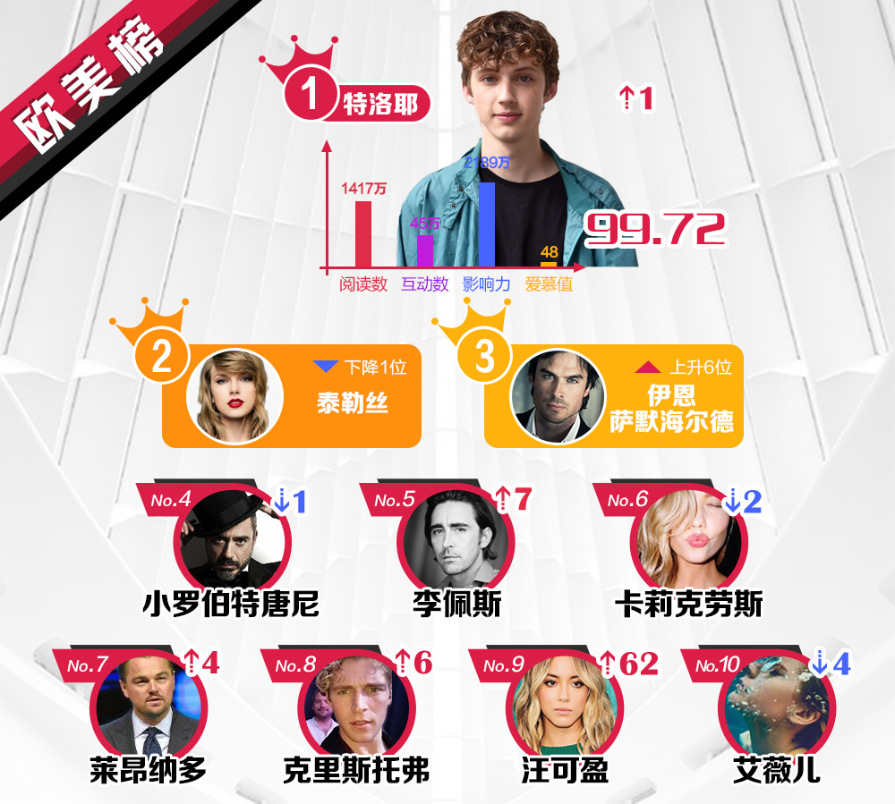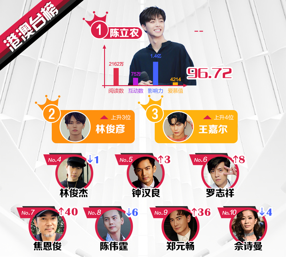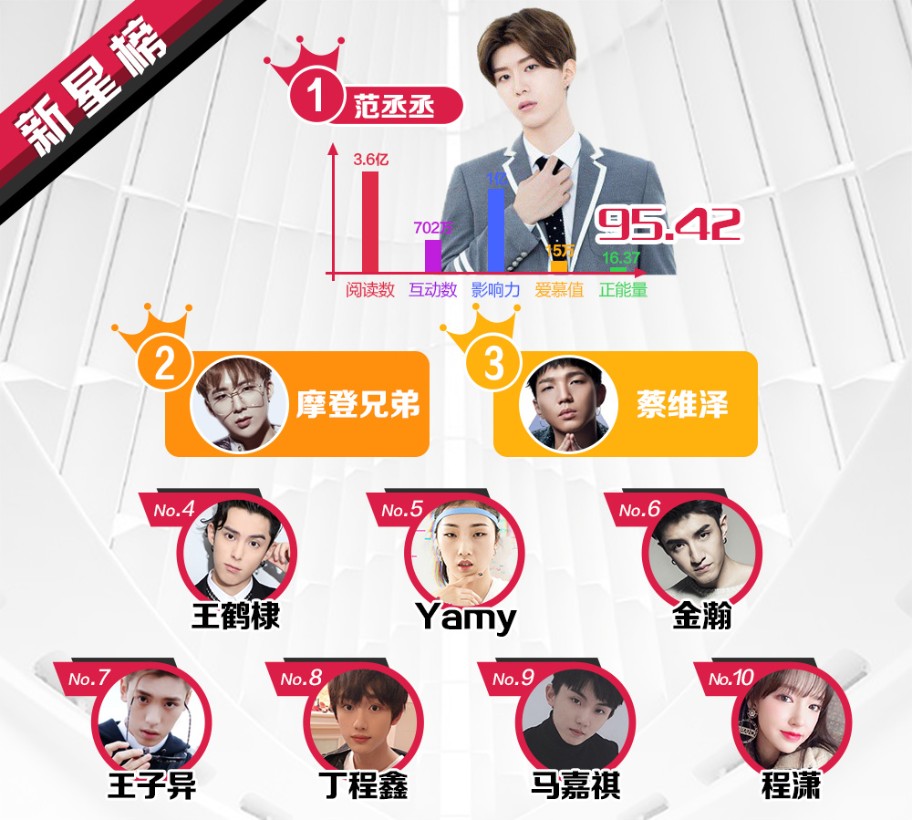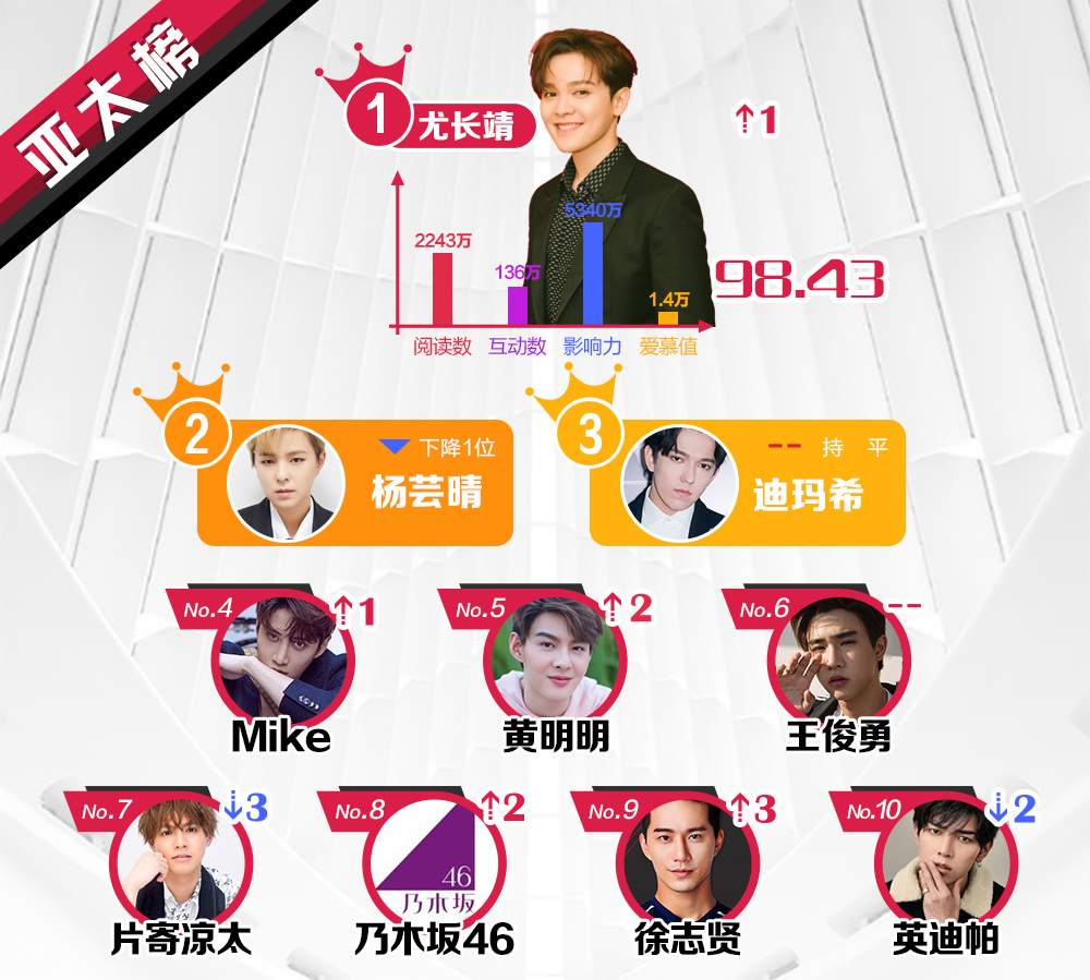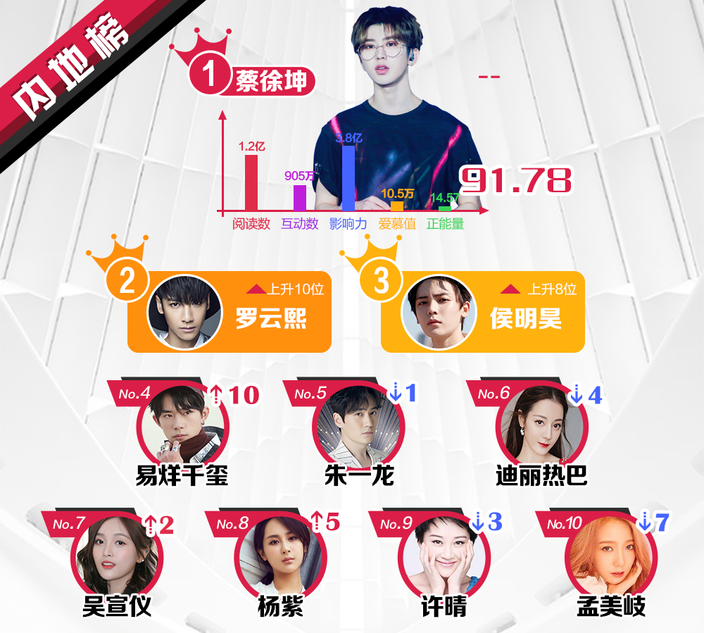 Vừa qua, bảng xếp hạng những ngôi sao quyền lực nhất đầu tháng 12 thông qua mạng xã hội Weibo ở các khu vực Trung Quốc, Hồng Kông, Macao - Đài Loan, các quốc gia châu Á - Thái Bình Dương và châu Âu - Hoa Kỳ đã được công bố. Được biết, để có kết quả cần dựa vào chỉ số đề cập, chỉ số tương tác, lượt xem, chia sẻ, yêu thích và lượng tìm kiếm trên Weibo từ 27/1 đến hết ngày 03/12. Xem qua TOP 10 ngôi sao quyền lực: