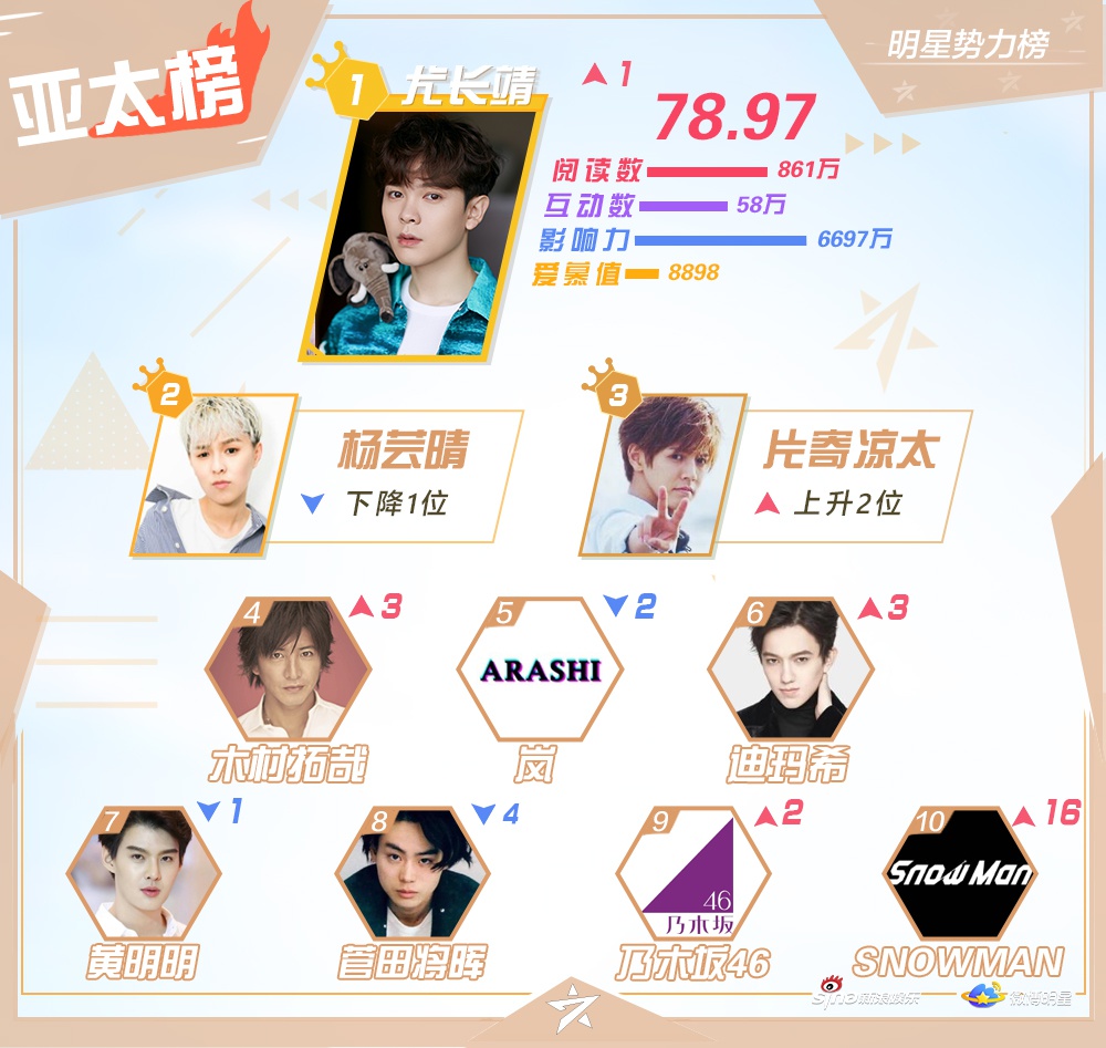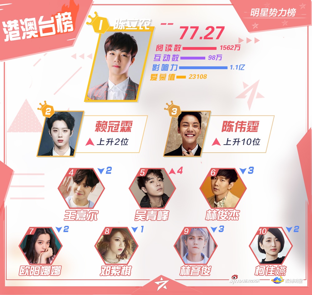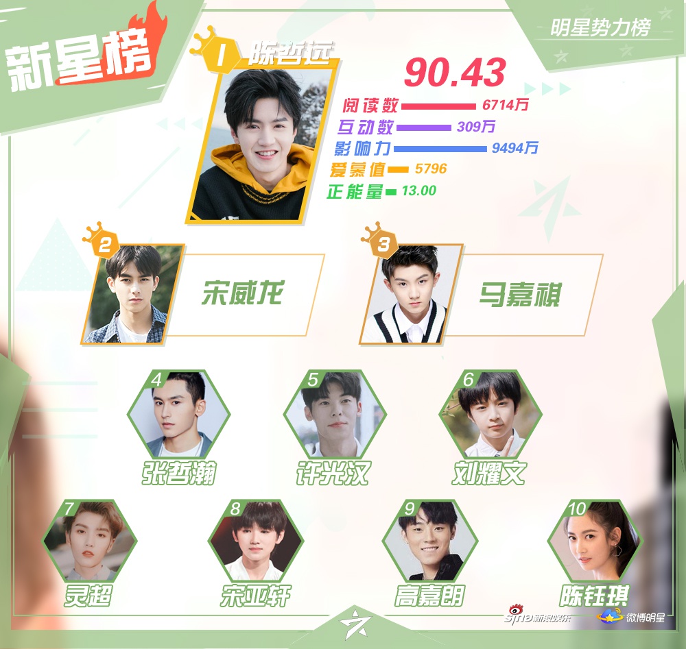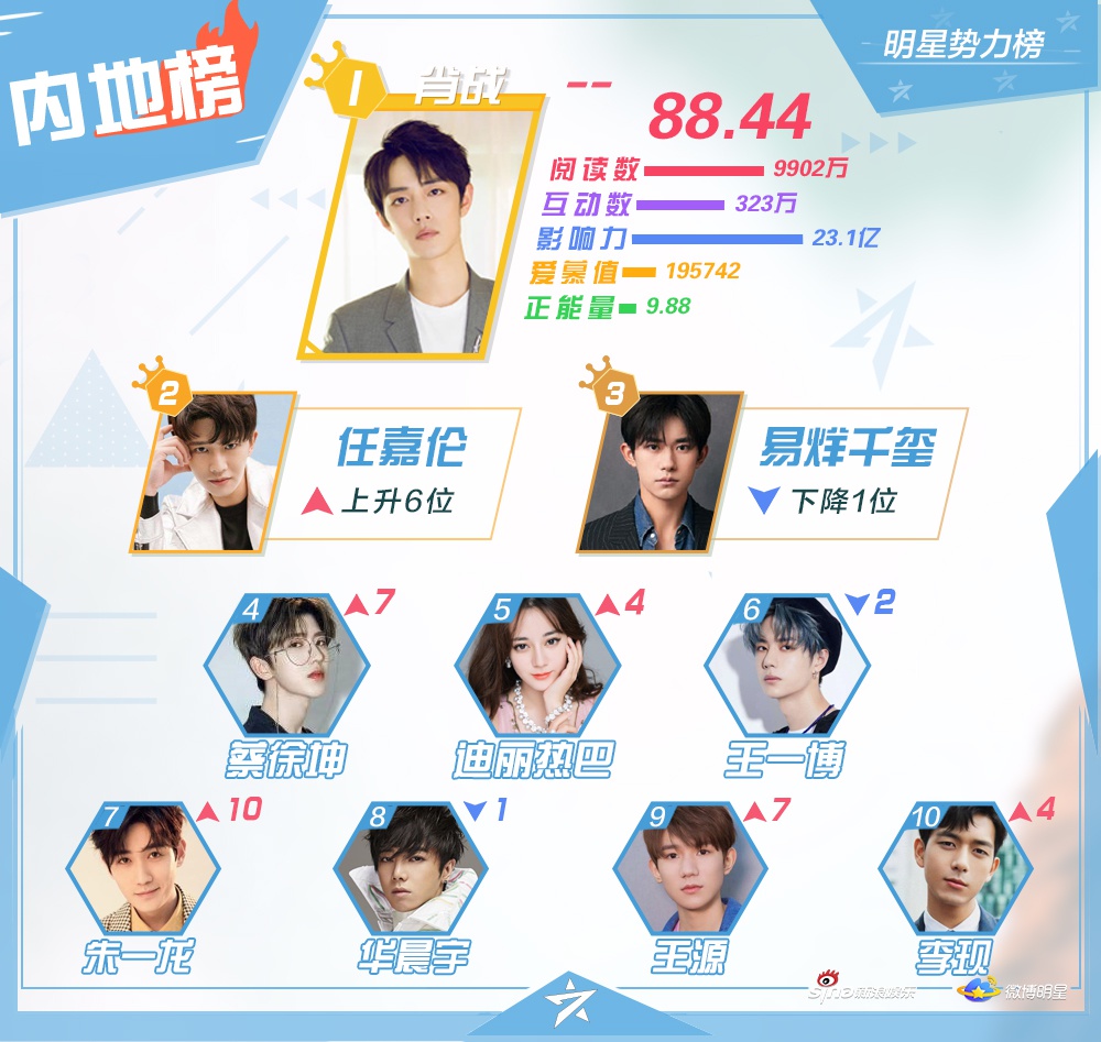 Mặt khác, xếp hạng của Dịch Dương Thiên Tỉ và Vương Nhất Bác đều giảm. Trong khi, Nhậm Gia Luân tiếp tục tăng mạnh, vươn lên vị trí thứ Á quân trong bảng xếp hạng Đại Lục. Anh ấy thu hút sự chú ý từ người hâm mộ cũng như khán giả châu Á qua phim truyền hình cổ trang Cẩm y chi hạ.