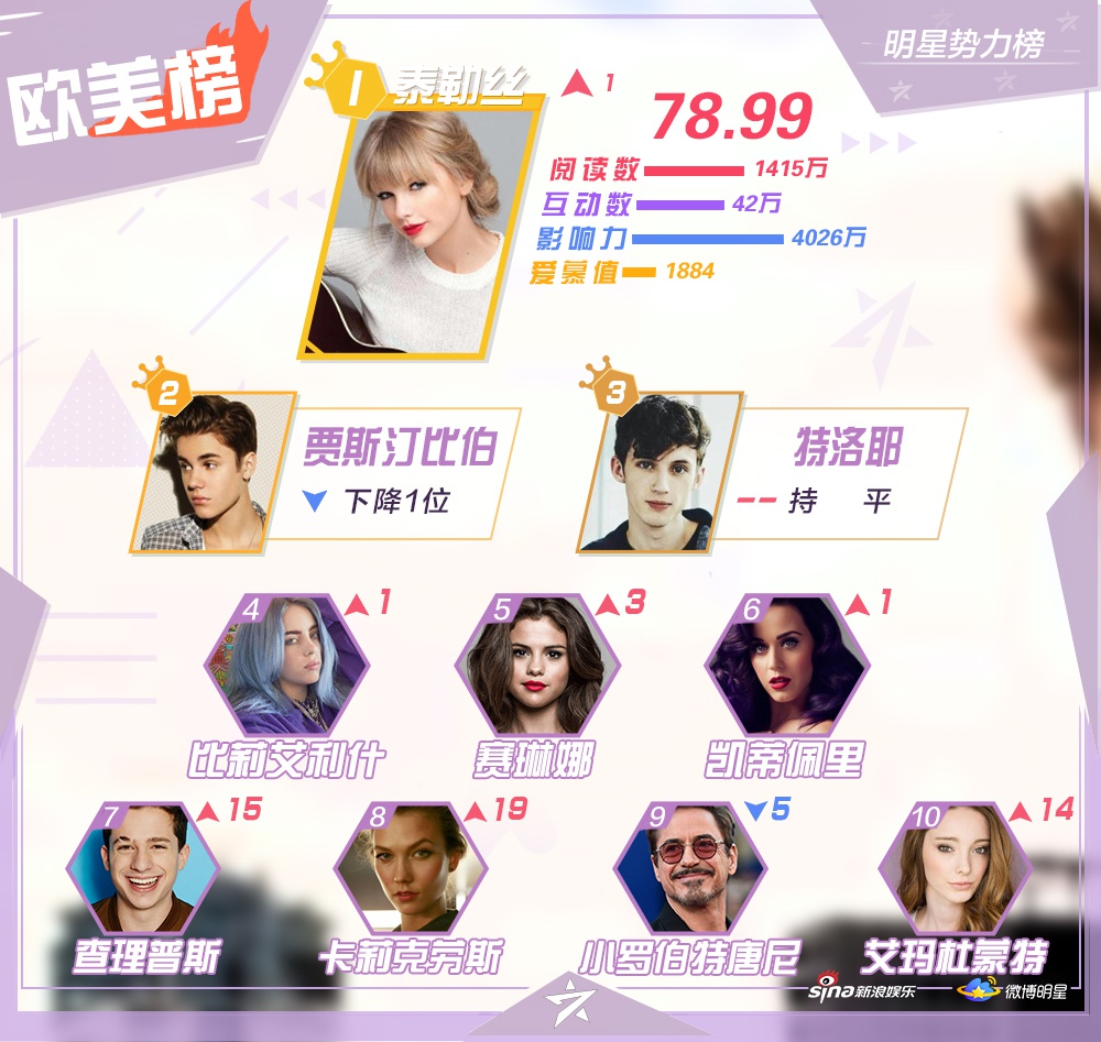 Mới đây, Sina Entertainment đã công bố Top 10 những nghệ sĩ nổi tiếng, hiện đang hoạt động ở khu vực Đại Lục Trung Quốc, Hong Kong, Macao - Đài Loan, các quốc gia châu Á - Thái Bình Dương, châu Âu - Hoa Kỳ và xếp hạng ngôi sao mới trên mạng xã hội Weibo vào đầu tuần của tháng Ba.