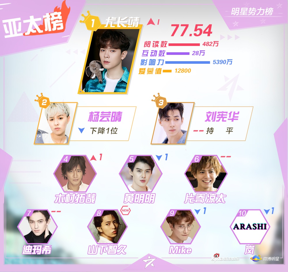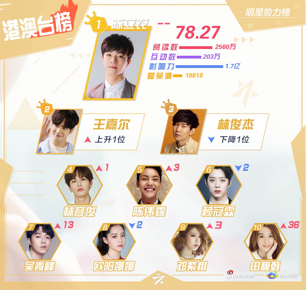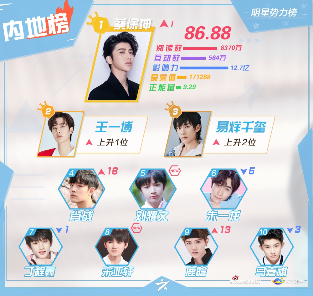 So với tuần trước, xếp hạng của những ngôi sao đang được công chúng quan tâm có nhiều sự thay đổi, đặc biệt là đối với các nghệ sĩ thuộc khu vực Đại Lục. Trong đó, Thái Từ Khôn đã trở lại với ngôi vị Quán quân sau khoảng 30 tuần bị soán ngôi chủ yếu bởi Tiêu Chiến và Vương Nhất Bác. Mặt khác, mặc dù bị loại khỏi top 10 trong tuần trước nhưng Tiêu Chiến đã trở lại, tăng 16 hạng để đứng vị trí thứ tư. Trong khi, Vương Nhất Bác và Dịch Dương Thiên Tỉ đều lần lượt tăng thứ hạng của mình.
