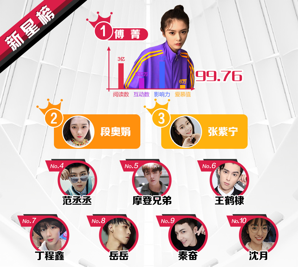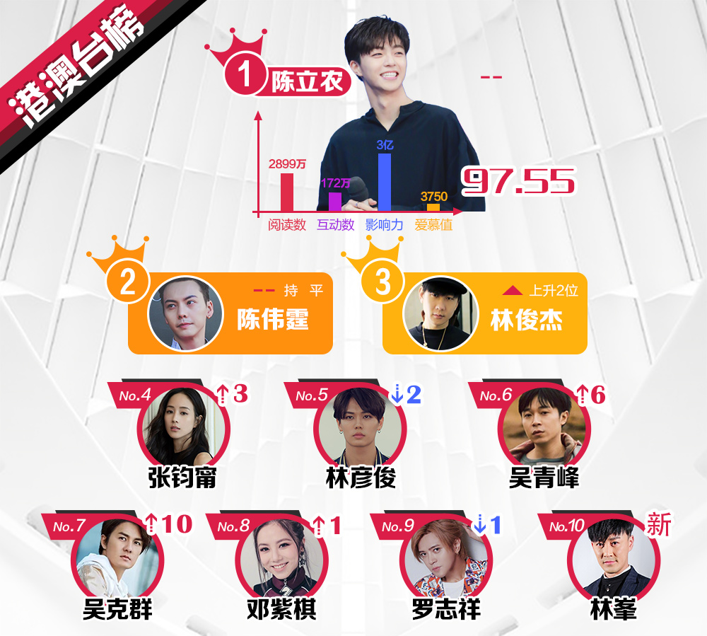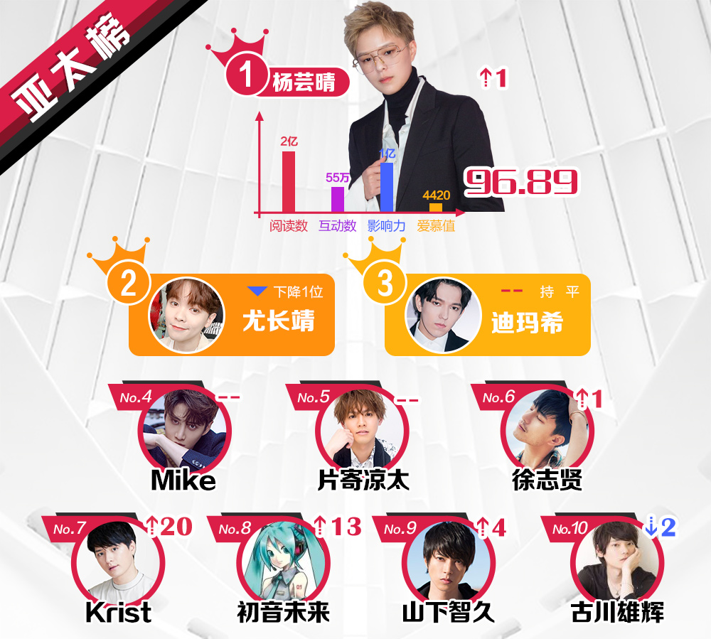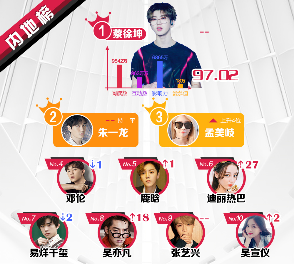 Thái Từ Khôn của Nine Percent và Chu Nhất Long vẫn duy trì hai vị trí đầu. Trong khi, Mạnh Mỹ Kỳ tăng 4 hạng, Đặng Luân giảm một hạng. Lộc Hàm hạng 5, theo sau là Địch Lệ Nhiệt Ba, nữ diễn viên vượt 27 đối thủ để chiếm vị trí thứ 6. Theo đó, những vị trí còn lại thuộc về Dịch Dương Thiên Tỉ của TFBOYS, Ngô Diệc Phàm (tăng 18 hạng), Trương Nghệ Hưng và Ngô Tuyên Nghi.