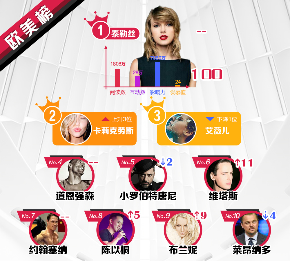 Taylor Swift vẫn đứng đầu, Karlie Kloss tăng 3 hạng, trong khi Avril Lavigne giảm một hạng. Những vị trí còn lại lần lượt thuộc về Dwayne Johnson, Robert Downey Jr., Vitas, John Cena, Jason Chen, Britney Spears và Leonardo DiCaprio.