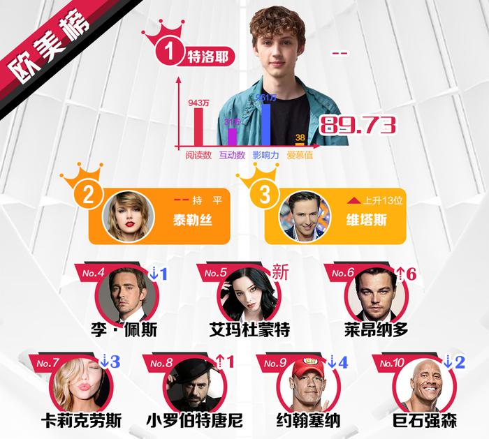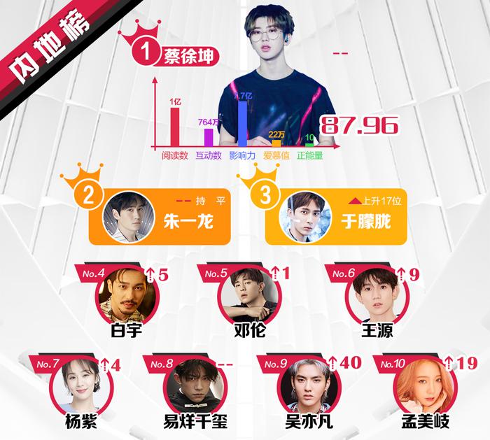 Đến hẹn lại lên, ngày 13/11 vừa qua, Sina Entertainment tiết lộ bảng xếp hạng những ngôi sao quyền lực nhất tuần 2 tháng 11 thông qua mạng xã hội Weibo ở khu vực Trung Quốc, Hồng Kông, Macao - Đài Loan, các quốc gia châu Á - Thái Bình Dương và châu Âu - Hoa Kỳ. Kết quả cuối cùng khi được công bố sẽ dựa vào chỉ số đề cập, chỉ số tương tác, lượt xem, chia sẻ, yêu thích và lượt tìm kiếm trên Weibo trong từ ngày 06/10 đến ngày 12/11. Theo đó, kết quả như sau: