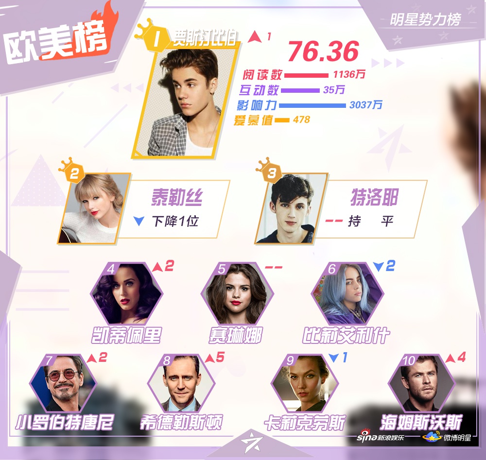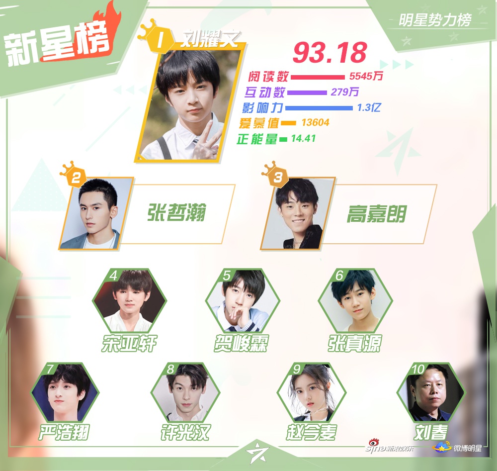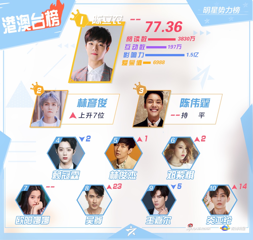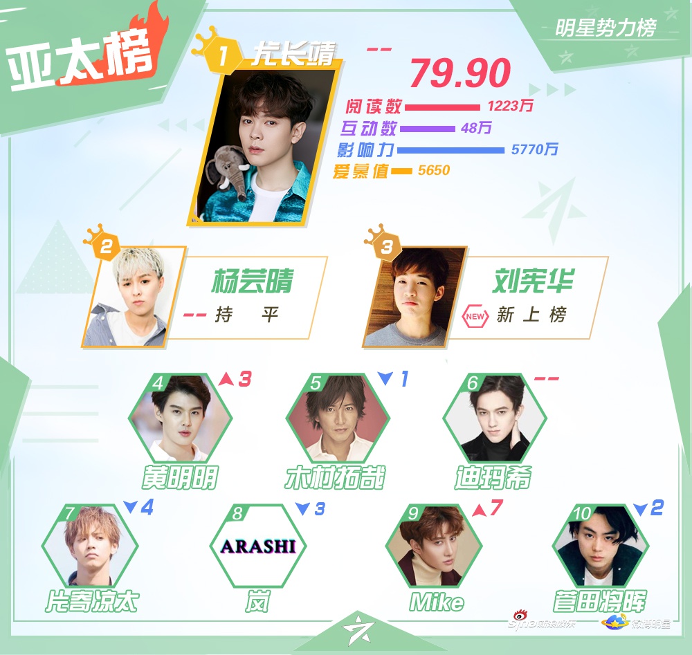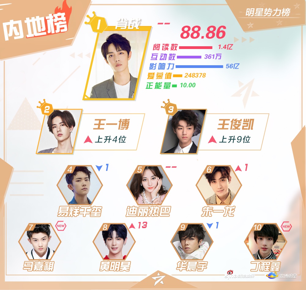 Trong những ngày vừa qua, Sina Entertainment đã tiết lộ 10 những nghệ sĩ nổi tiếng, hiện đang hoạt động ở khu vực Đại Lục Trung Quốc, Hong Kong, Macao - Đài Loan, các quốc gia châu Á - Thái Bình Dương, châu Âu - Hoa Kỳ và xếp hạng ngôi sao mới trên mạng xã hội Weibo vào tuần 2 tháng 3.