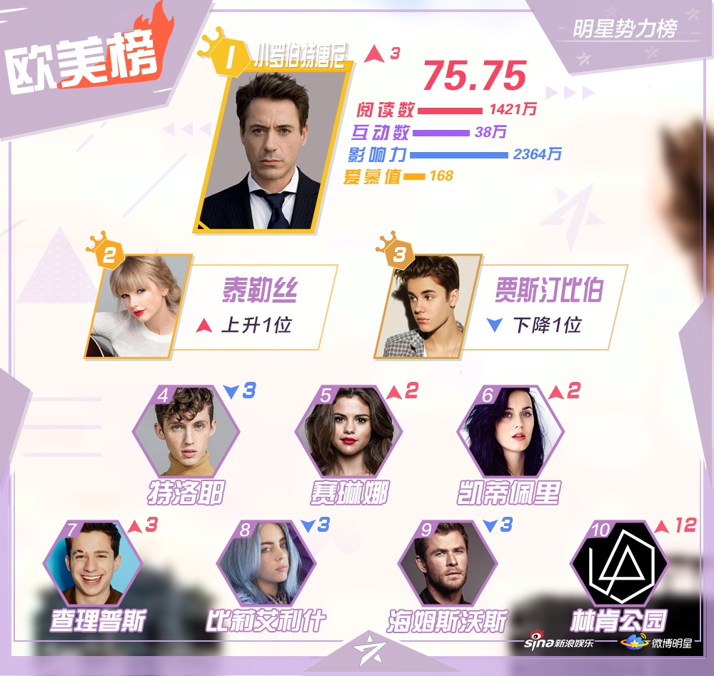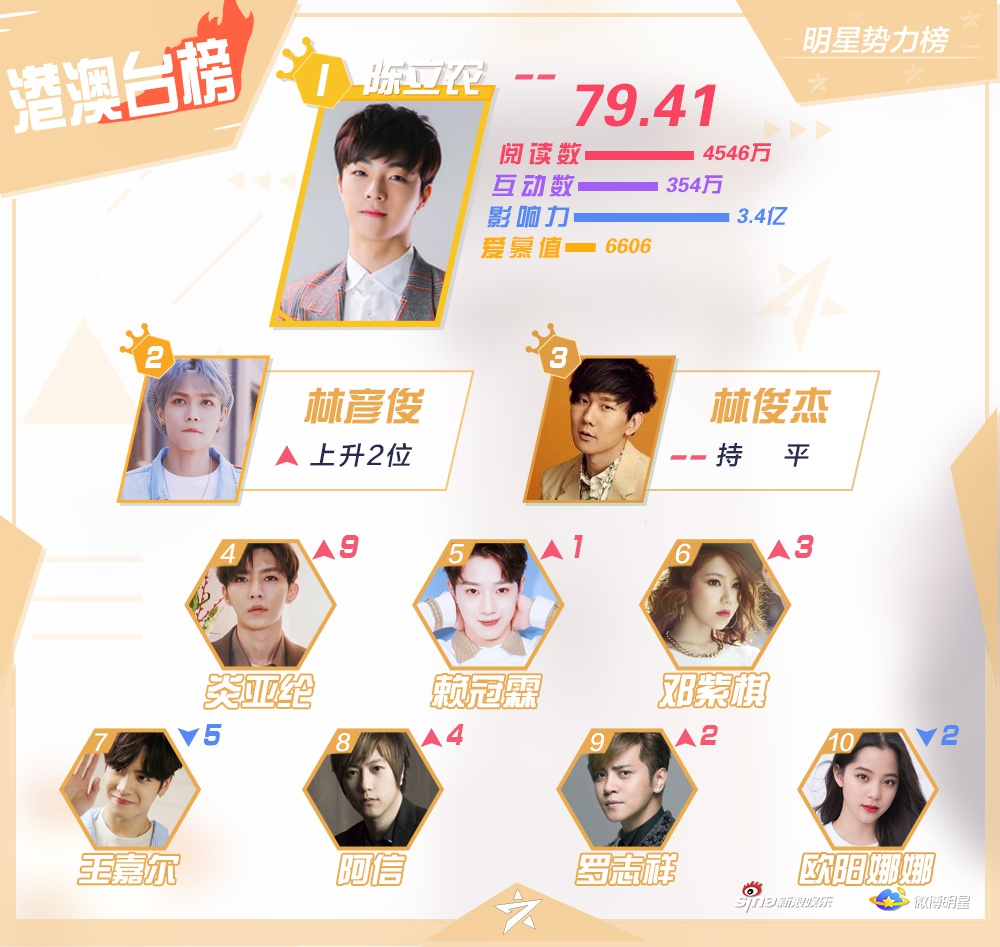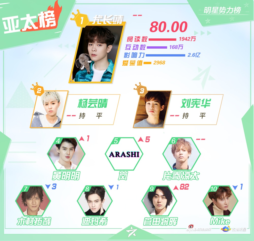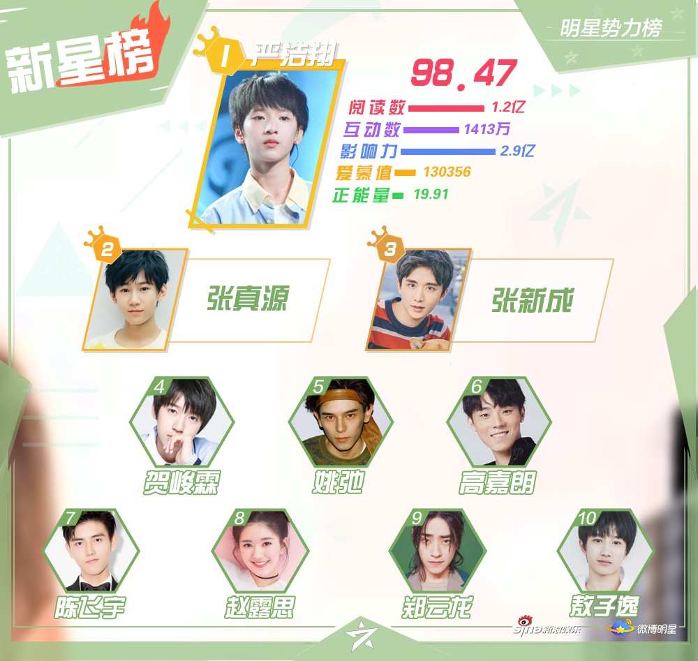 Mới đây, Sina Entertainment đã tiết lộ 10 những nghệ sĩ nổi tiếng, hiện đang hoạt động ở khu vực Đại Lục Trung Quốc, Hong Kong, Macao - Đài Loan, các quốc gia châu Á - Thái Bình Dương, châu Âu - Hoa Kỳ và xếp hạng ngôi sao mới trên mạng xã hội Weibo vào đầu tháng Tư năm 2020.