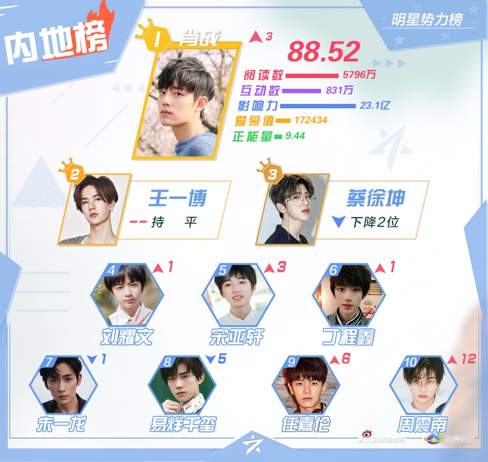Trong danh sách Đại Lục, xếp hạng đã có nhiều thay đổi trong tuần này. Nam diễn viên Tiêu Chiến đã trở lại với chức vô địch sau 5 tuần tụt hạng sau khi phát hành ca khúc mới Song of Red Plum (Hồng Mai Tán). Mặt khác, Vương Nhất Bác duy tiếp tục duy trì vị trí thứ hai, trong khi Thái Từ Khôn bị tụt xuống hạng 3, nhưng sức ảnh hưởng thông qua chương trình Thanh xuân có bạn vẫn còn.