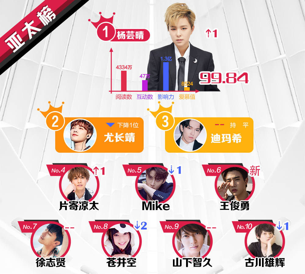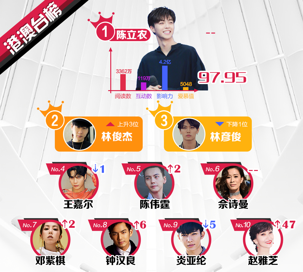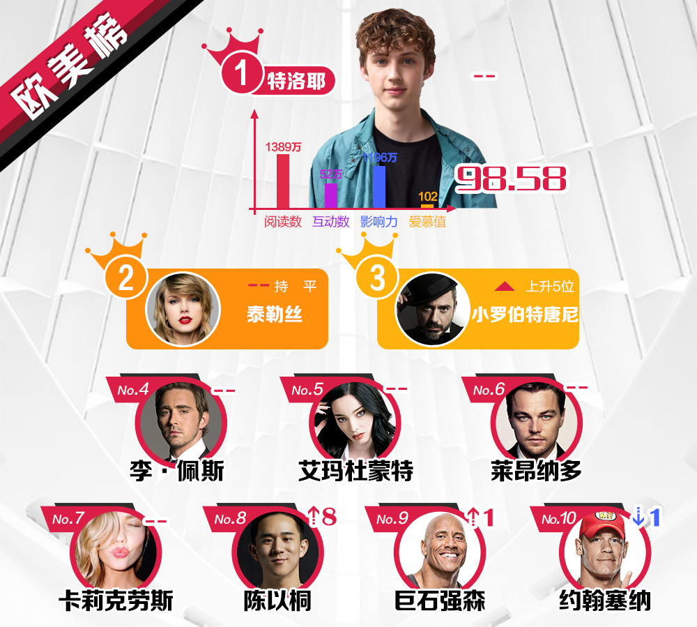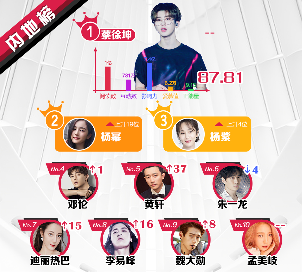 Sina Entertainment đã tiết lộ bảng xếp hạng những ngôi sao quyền lực nhất tuần 3 tháng 11 thông qua mạng xã hội Weibo ở khu vực Trung Quốc, Hồng Kông, Macao - Đài Loan, các quốc gia châu Á - Thái Bình Dương và châu Âu - Hoa Kỳ vào ngày 20/11 vừa qua. Kết quả cuối cùng khi được công bố sẽ dựa vào chỉ số đề cập, chỉ số tương tác, lượt xem, chia sẻ, yêu thích và lượt tìm kiếm trên Weibo trong từ ngày 12/11 đến ngày 19/11.
