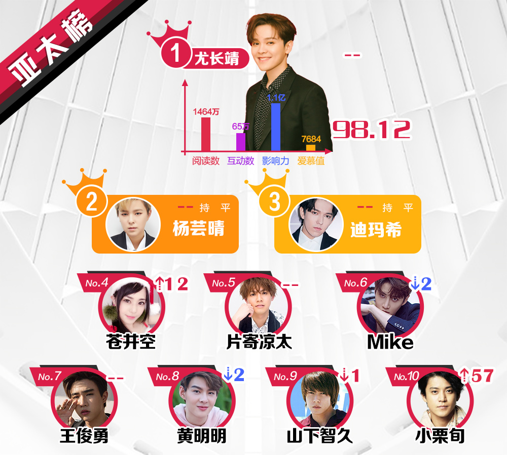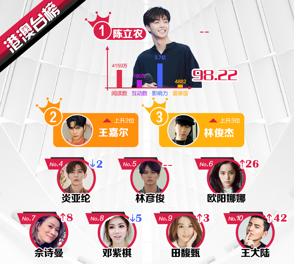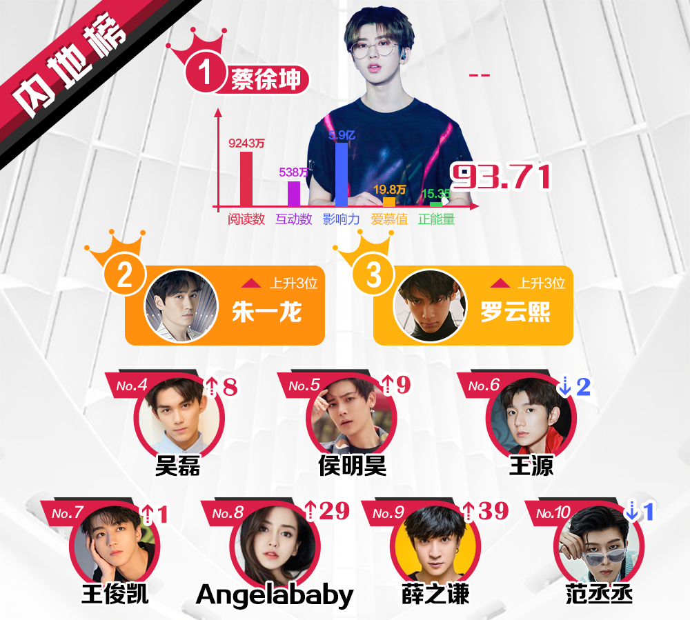 Ngày 18/12, Sina công bố bảng xếp hạng ngôi sao quyền lực nhất trên mạng xã hội Weibo tuần 3 tháng 12 ở các khu vực Trung Quốc, Hồng Kông, Macao - Đài Loan, các quốc gia châu Á - Thái Bình Dương và châu Âu - Hoa Kỳ. Theo đó, kết quả của danh sách này dựa vào chỉ số truyền thông, tương tác, lượt xem, chia sẻ, yêu thích và lượng tìm kiếm trên Weibo từ 11/12 đến hết ngày 17/12. Xem qua TOP 10 ngôi sao quyền lực: