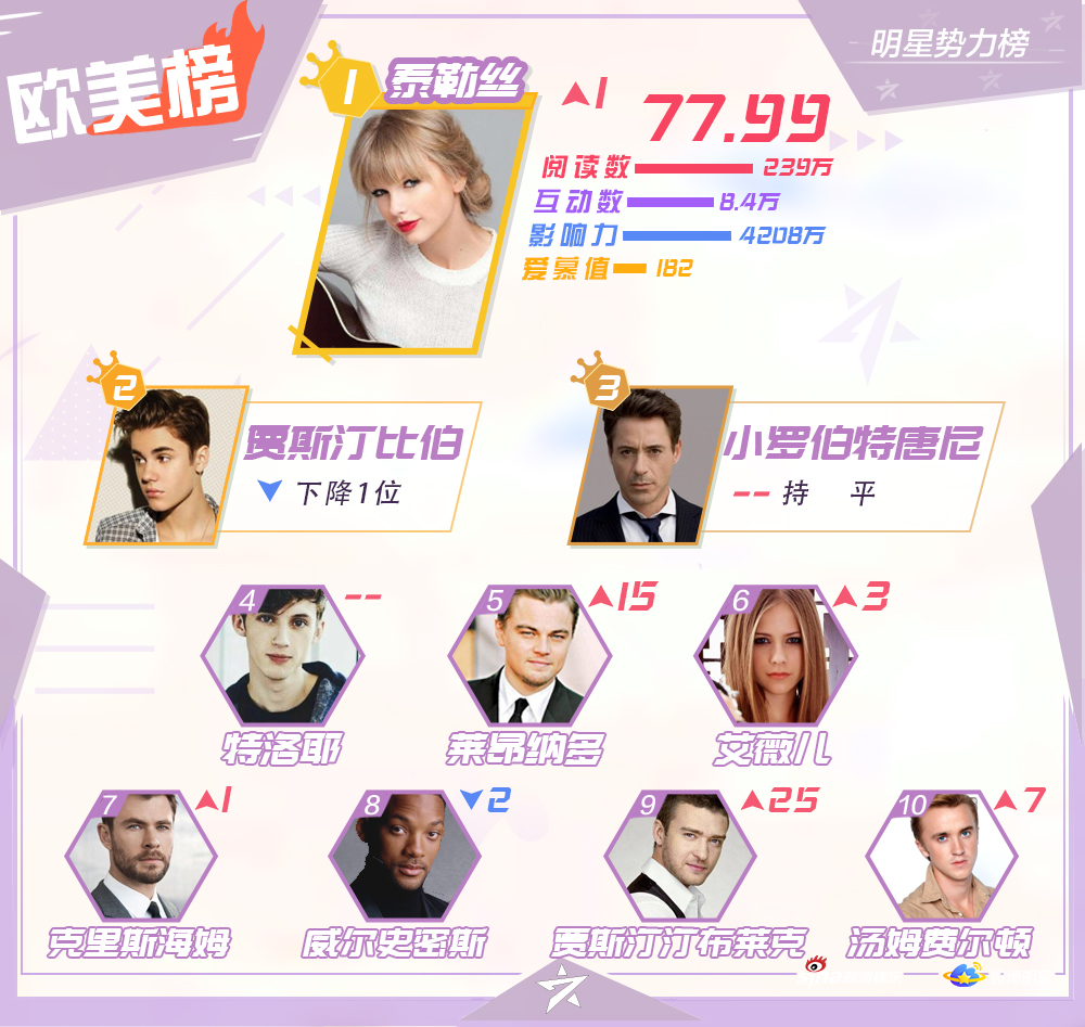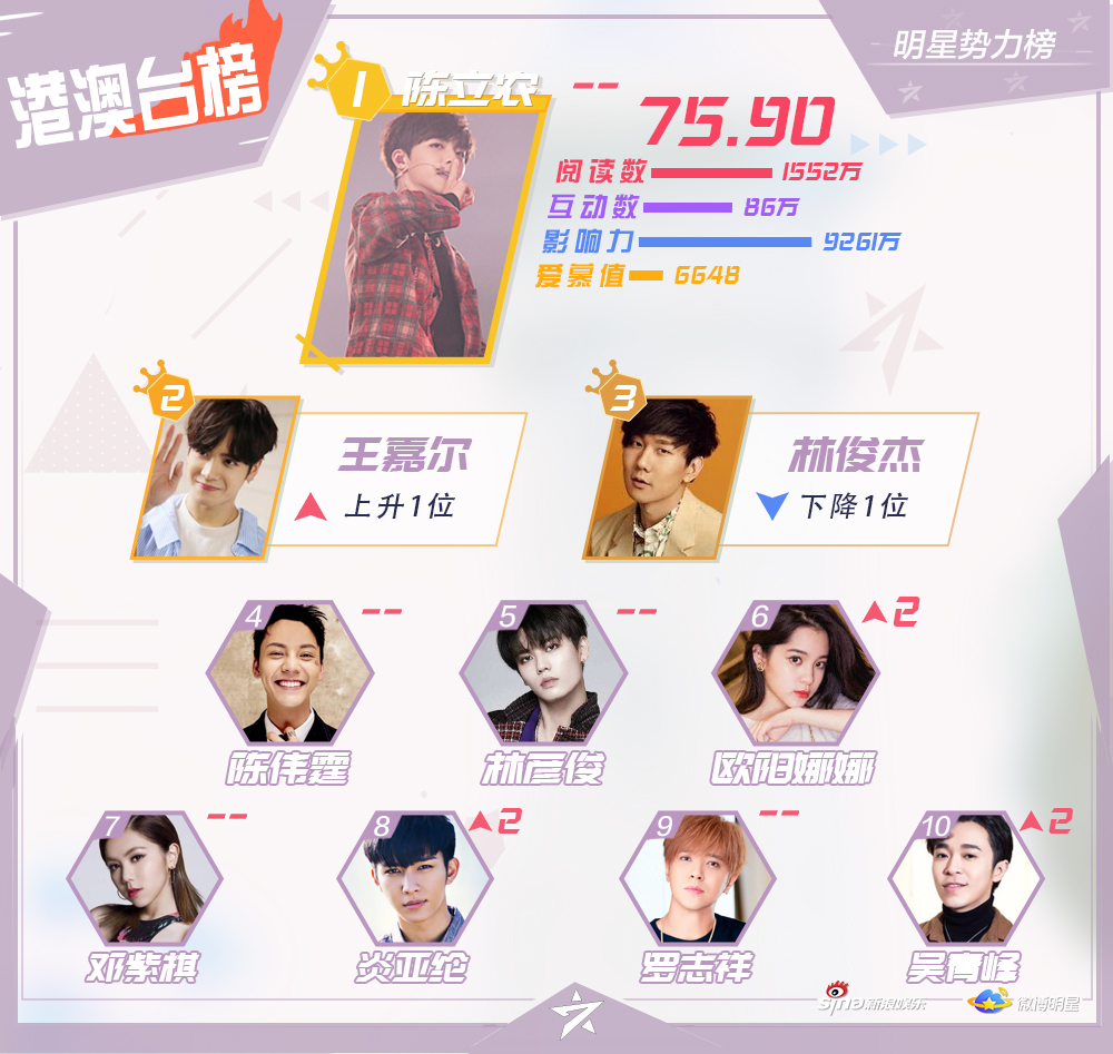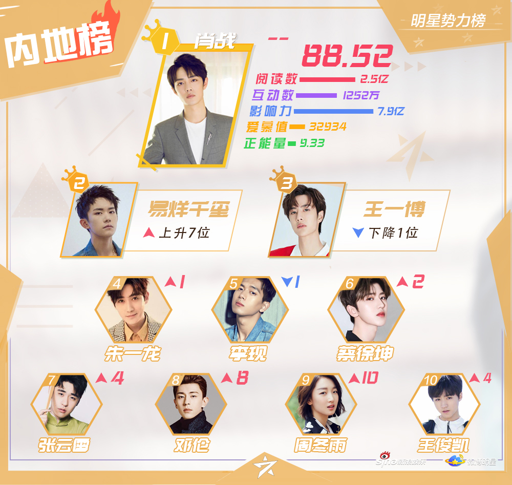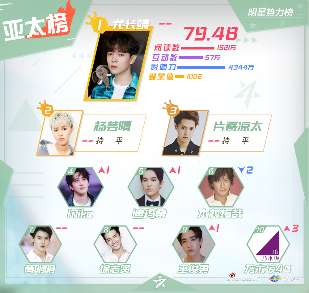 Vào ngày 29/10 vừa qua, Sina Entertainment đã tiết lộ Top 10 những nghệ sĩ nổi tiếng, hiện đang hoạt động ở khu vực Đại Lục Trung Quốc, Hong Kong, Macao - Đài Loan, các quốc gia châu Á - Thái Bình Dương và châu Âu - Hoa Kỳ trên mạng xã hội Weibo vào cuối tháng 10.