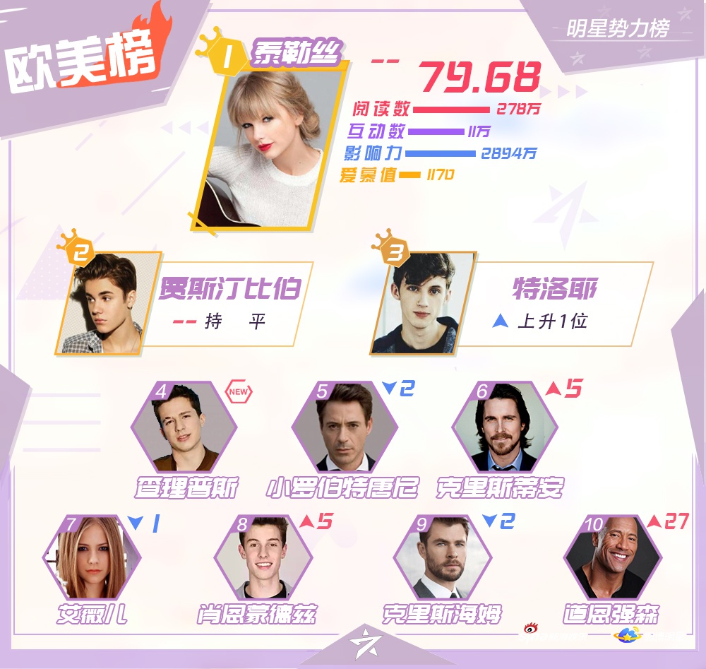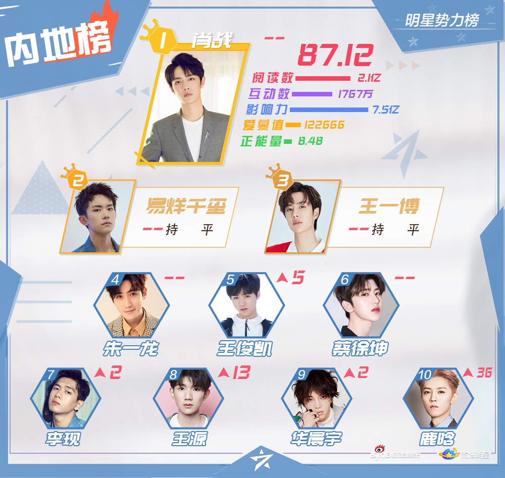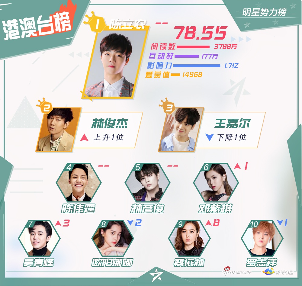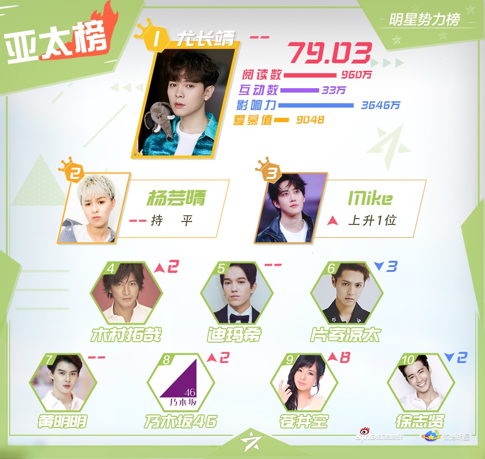 Vào ngày 05/11 vừa qua, Sina Entertainment đã công bốTop 10 những nghệ sĩ nổi tiếng, hiện đang hoạt động ở khu vực Đại Lục Trung Quốc, Hong Kong, Macao - Đài Loan, các quốc gia châu Á - Thái Bình Dương và châu Âu - Hoa Kỳ trên mạng xã hội Weibo vào cuối tháng 10.