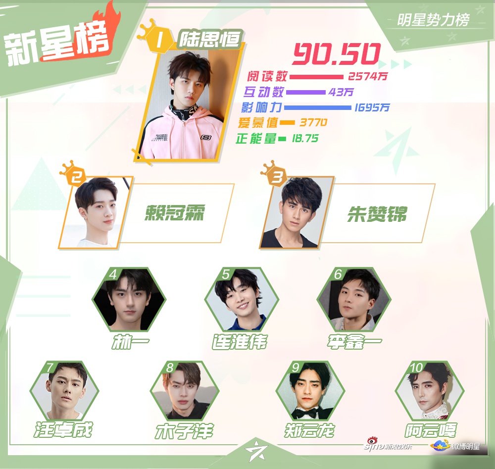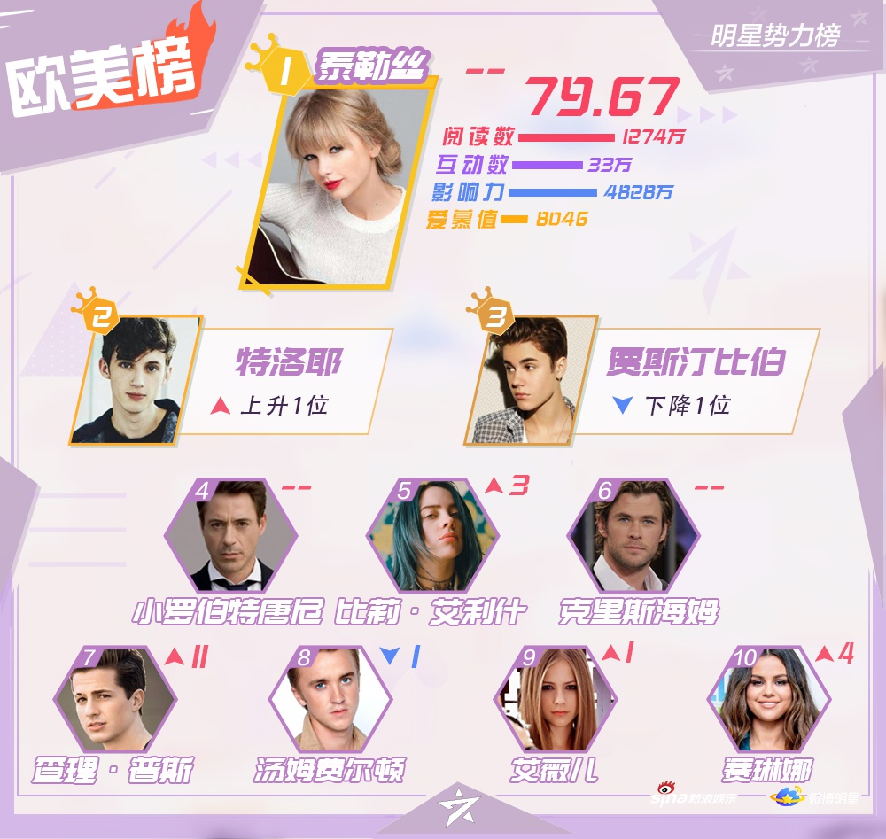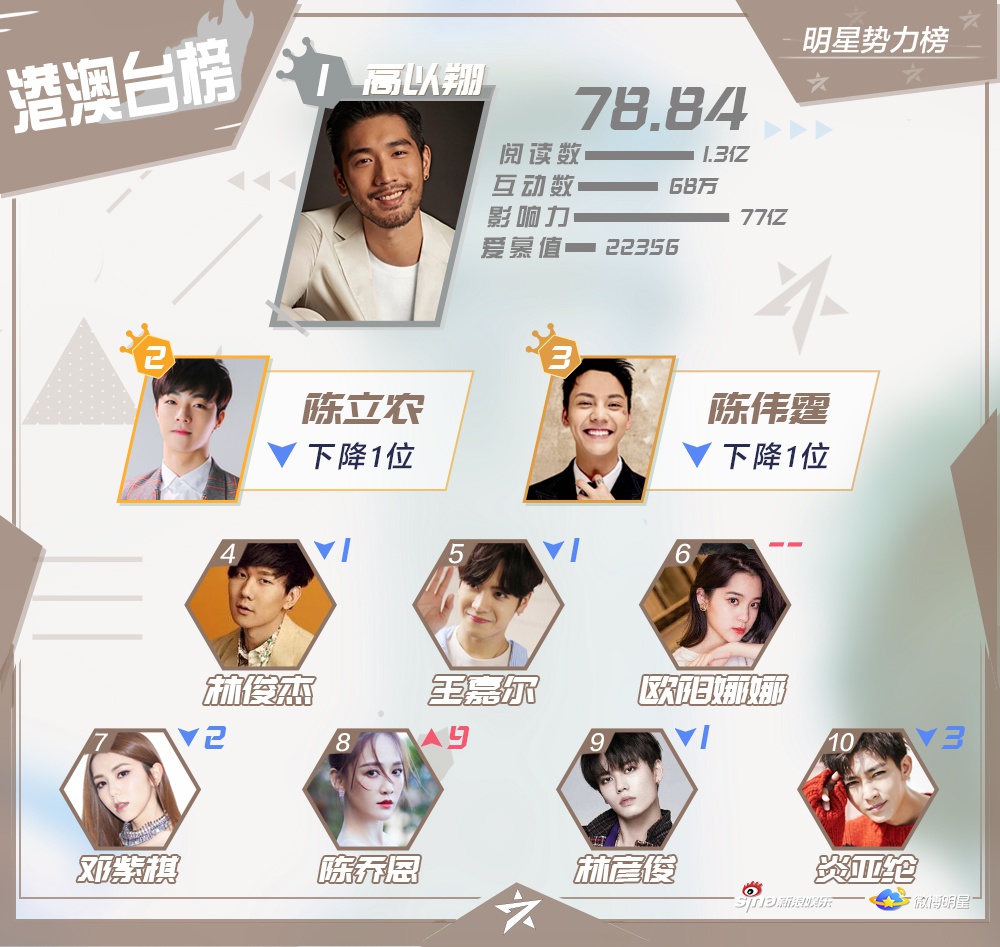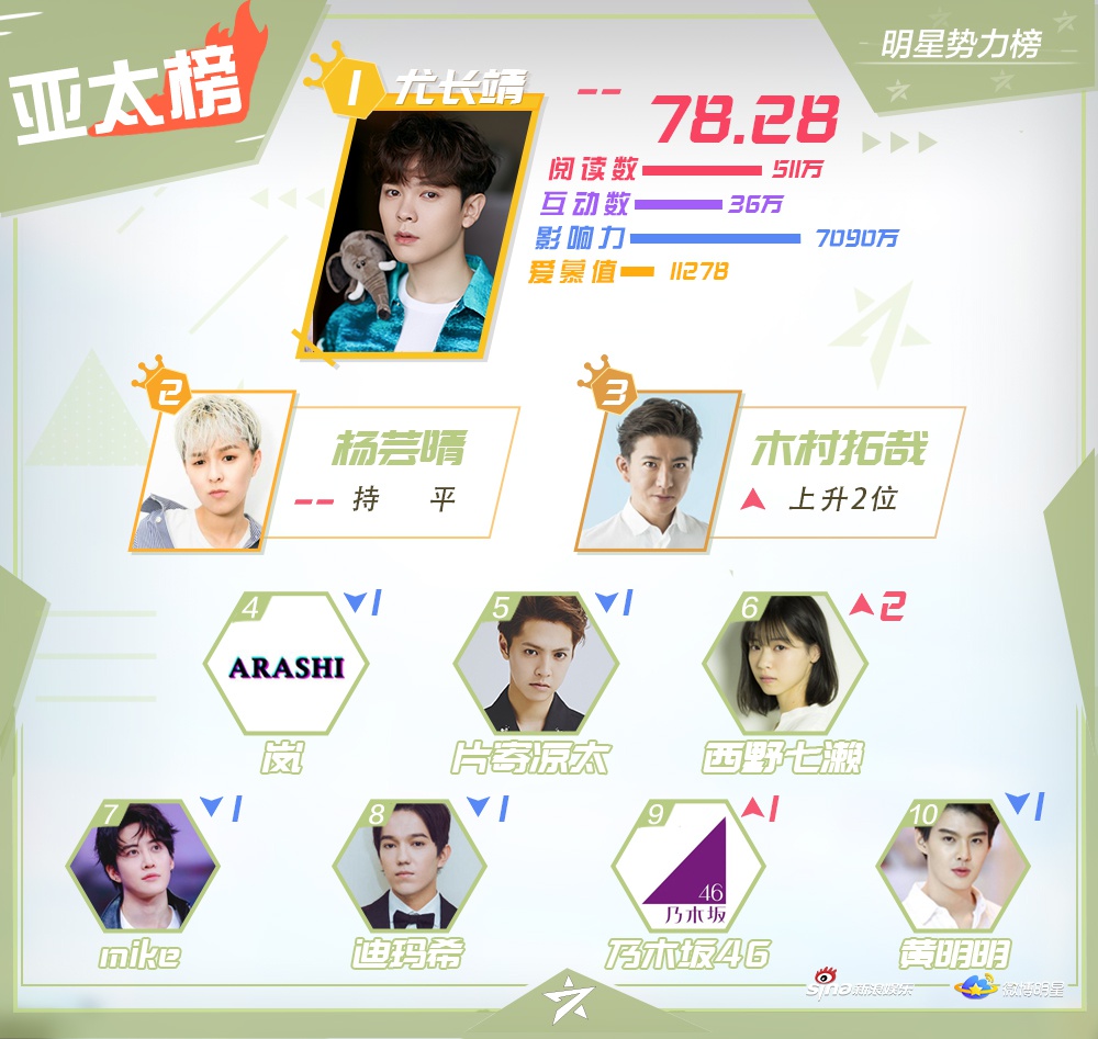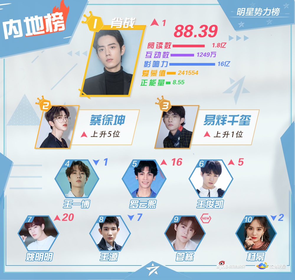 Mới đây, Sina Entertainment đã công bốTop 10 những nghệ sĩ nổi tiếng, hiện đang hoạt động ở khu vực Đại Lục Trung Quốc, Hong Kong, Macao - Đài Loan, các quốc gia châu Á - Thái Bình Dương và châu Âu - Hoa Kỳ trên mạng xã hội Weibo vào đầu tháng 12.