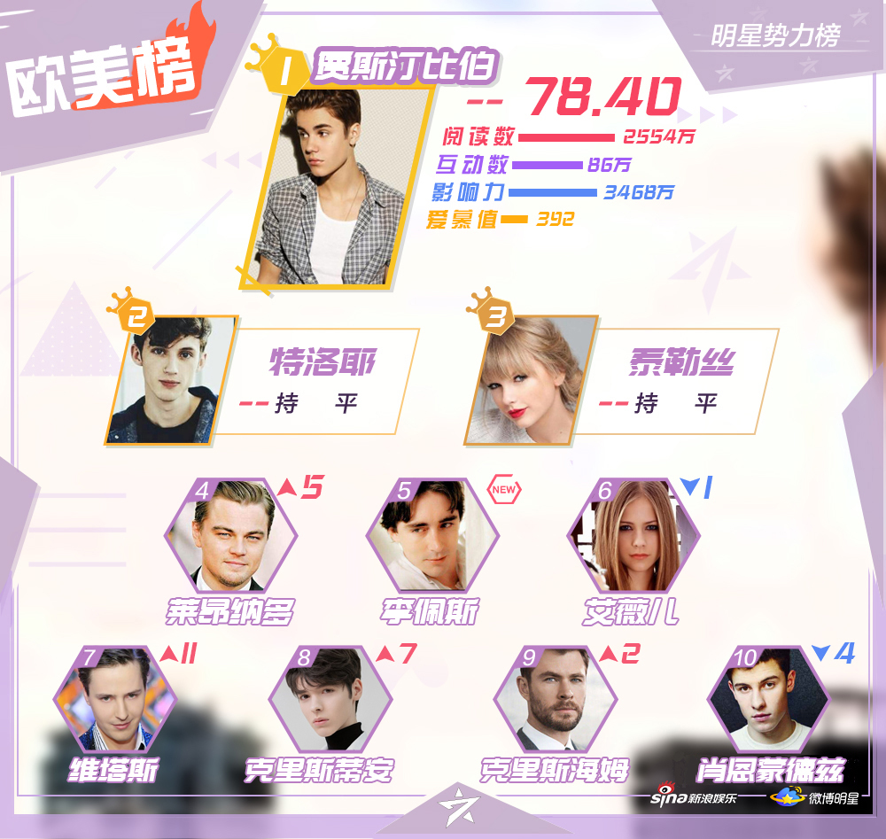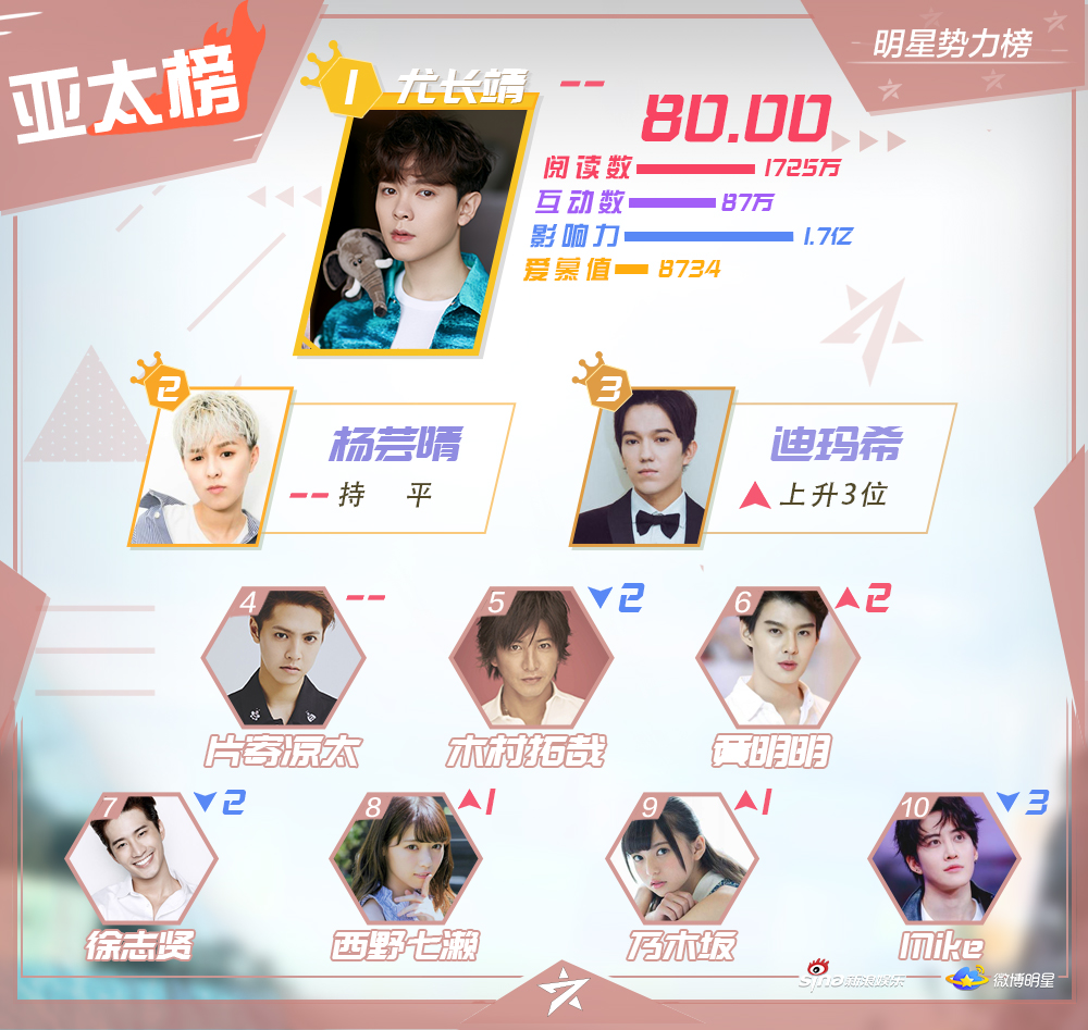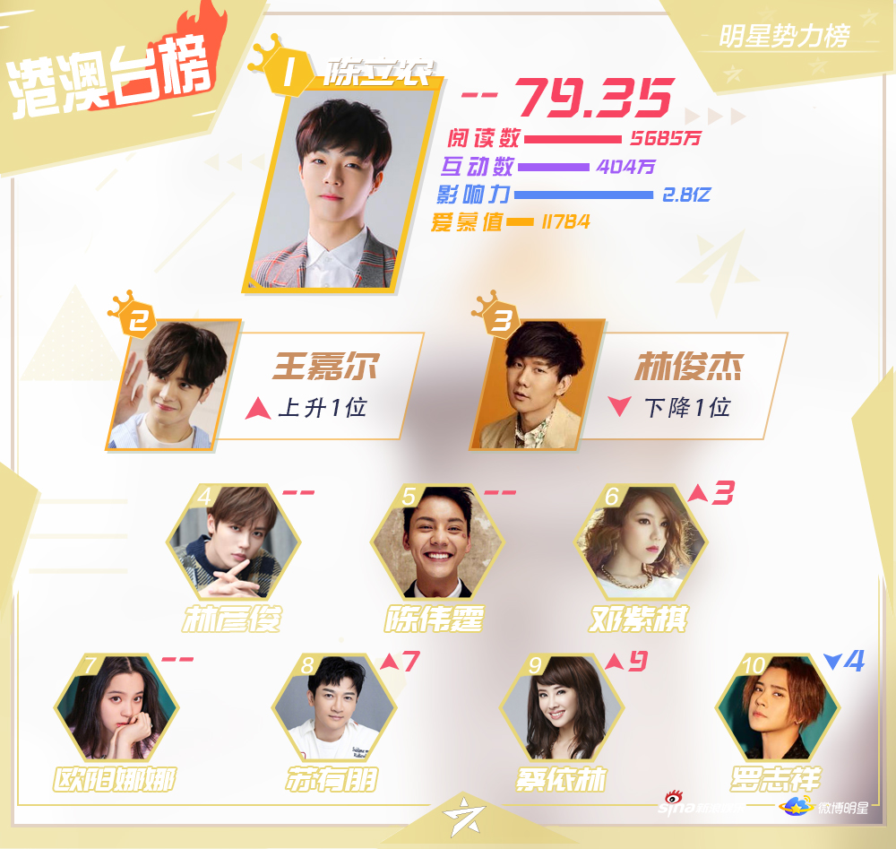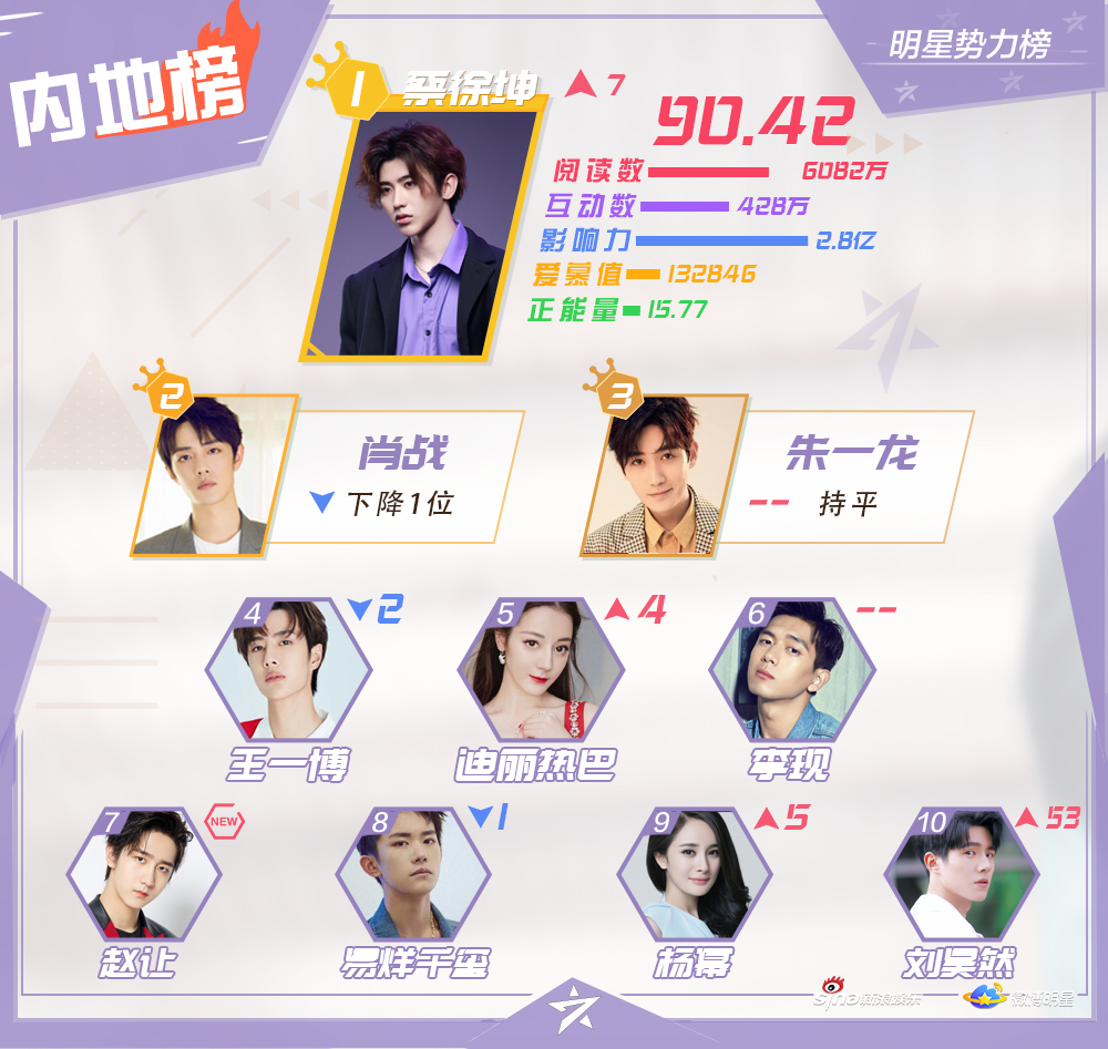 Ngày 08/10 vừa qua, Sina Entertainment đã tiết lộ Top 10 những nghệ sĩ nổi tiếng, hiện đang hoạt động ở khu vực Đại Lục Trung Quốc, Hong Kong, Macao - Đài Loan, các quốc gia châu Á - Thái Bình Dương và châu Âu - Hoa Kỳ trên mạng xã hội Weibo vào đầu tháng 9.