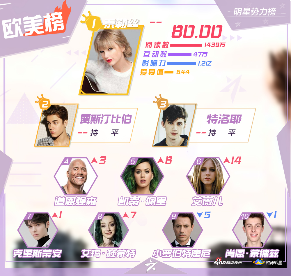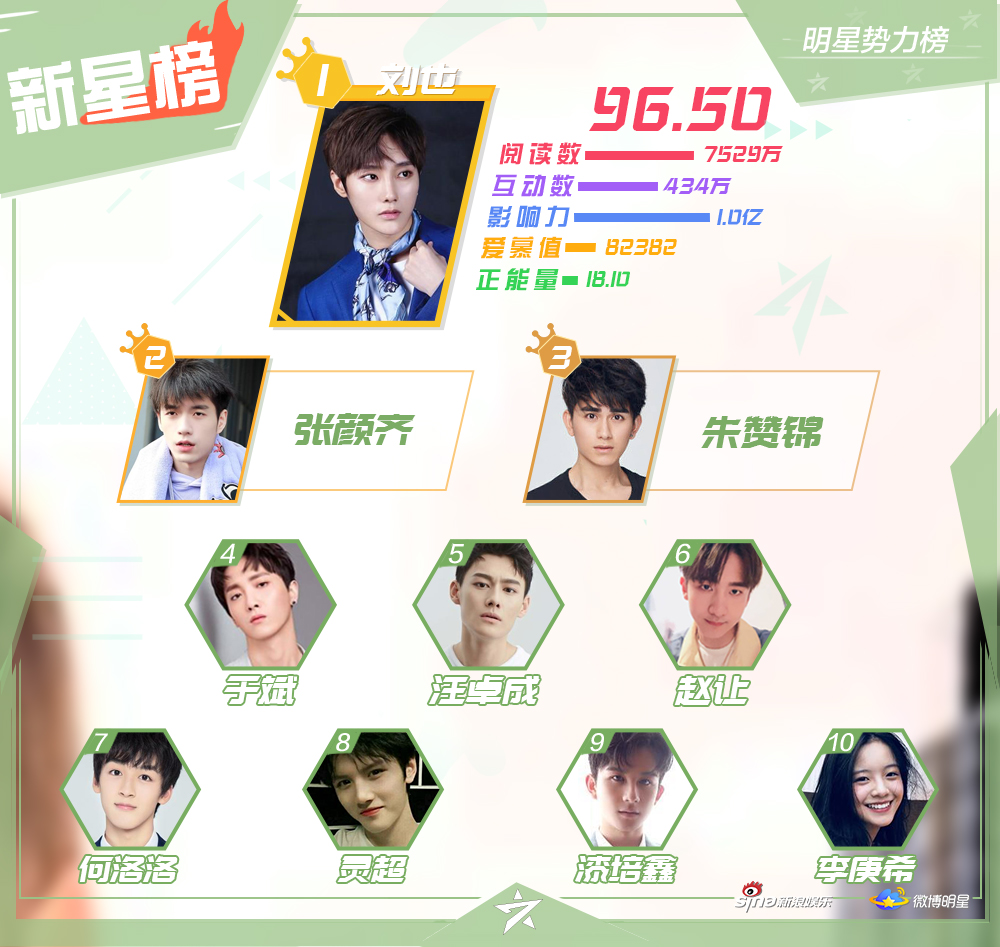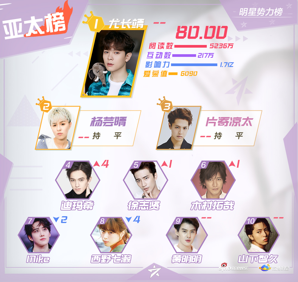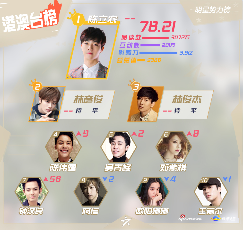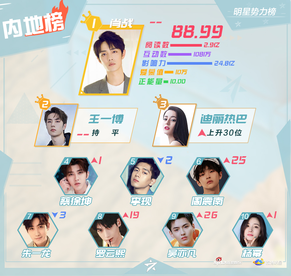 Mới đây, Sina Entertainment đã công bố Top 10 những nghệ sĩ nổi tiếng, hiện đang hoạt động ở khu vực Đại Lục Trung Quốc, Hong Kong, Macao - Đài Loan, các quốc gia châu Á - Thái Bình Dương và châu Âu - Hoa Kỳ trên mạng xã hội Weibo trong đầu tháng Chín.