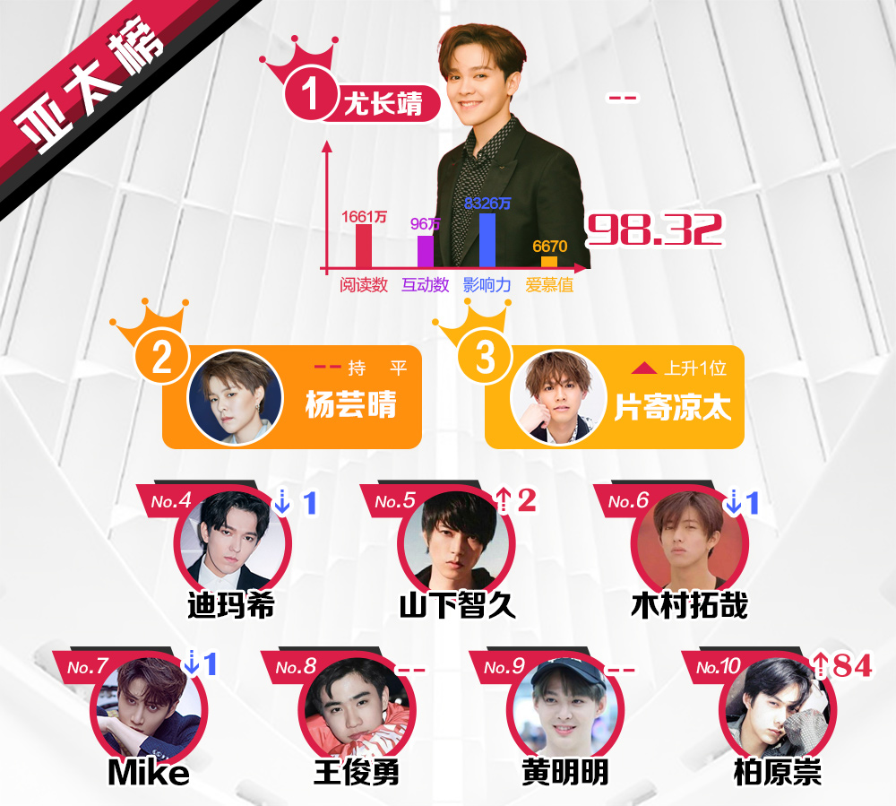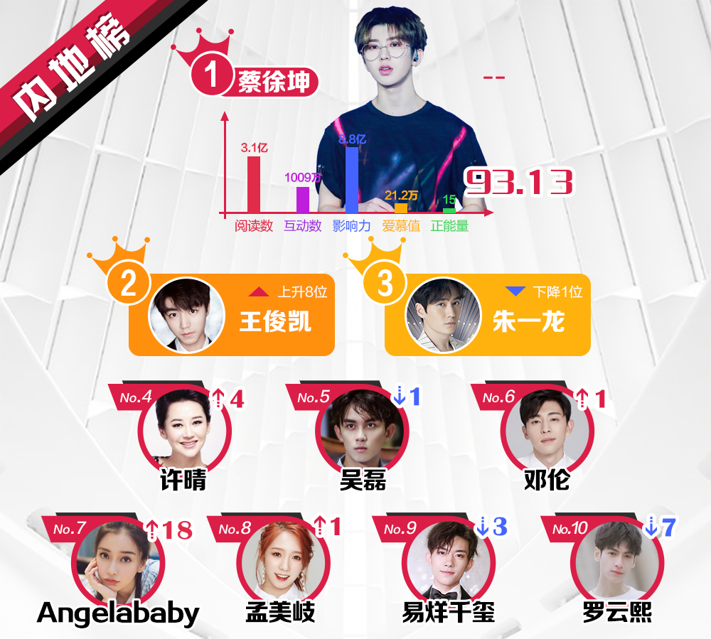 Để có kết quả, người ta sẽ phân tích và dựa vào tổng số điểm từ chỉ số truyền thông, tương tác, lượt xem, chia sẻ, yêu thích và lượt tìm kiếm, đánh giá trên Weibo từ 12/02 đến hết ngày 18/02. Dưới đây là TOP 10 thần tượng nổi tiếng nhất trong tuần qua: