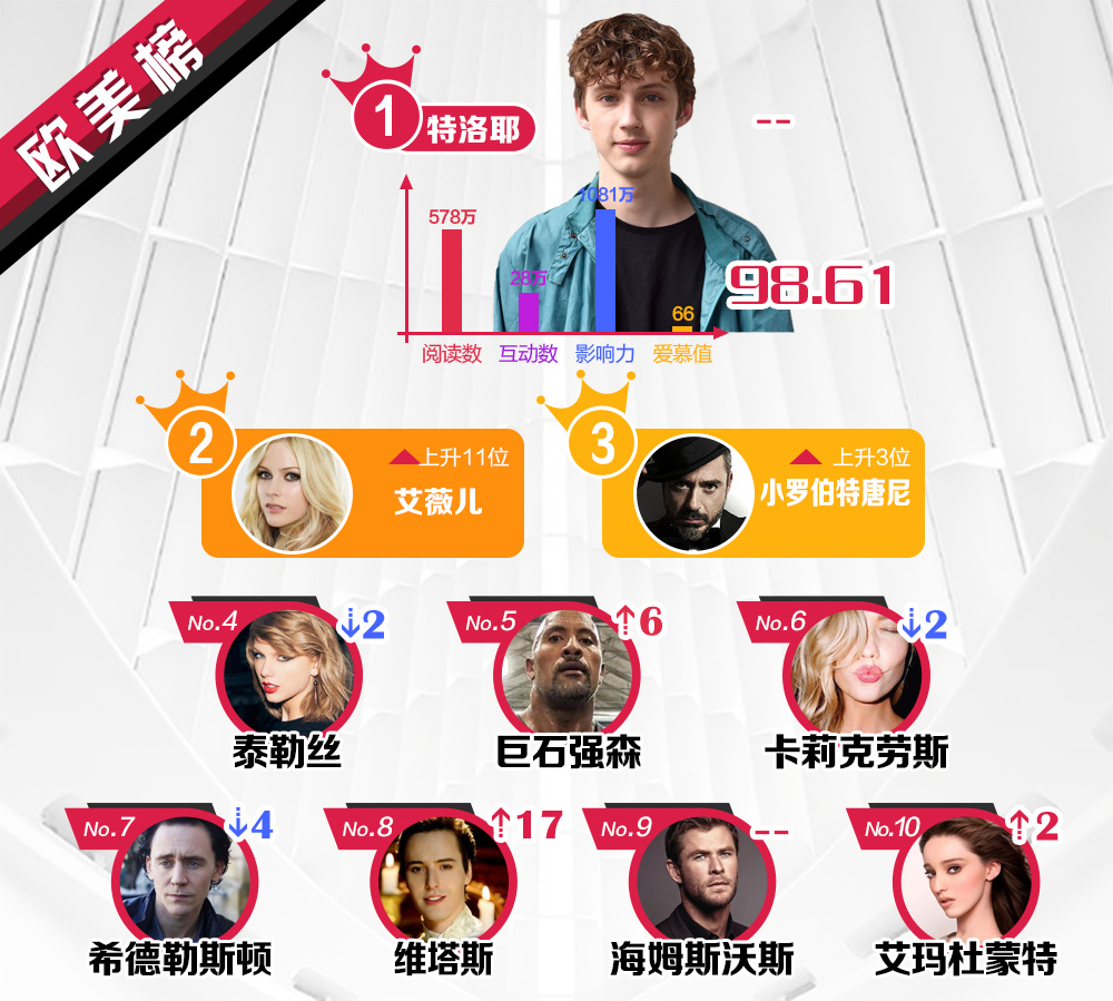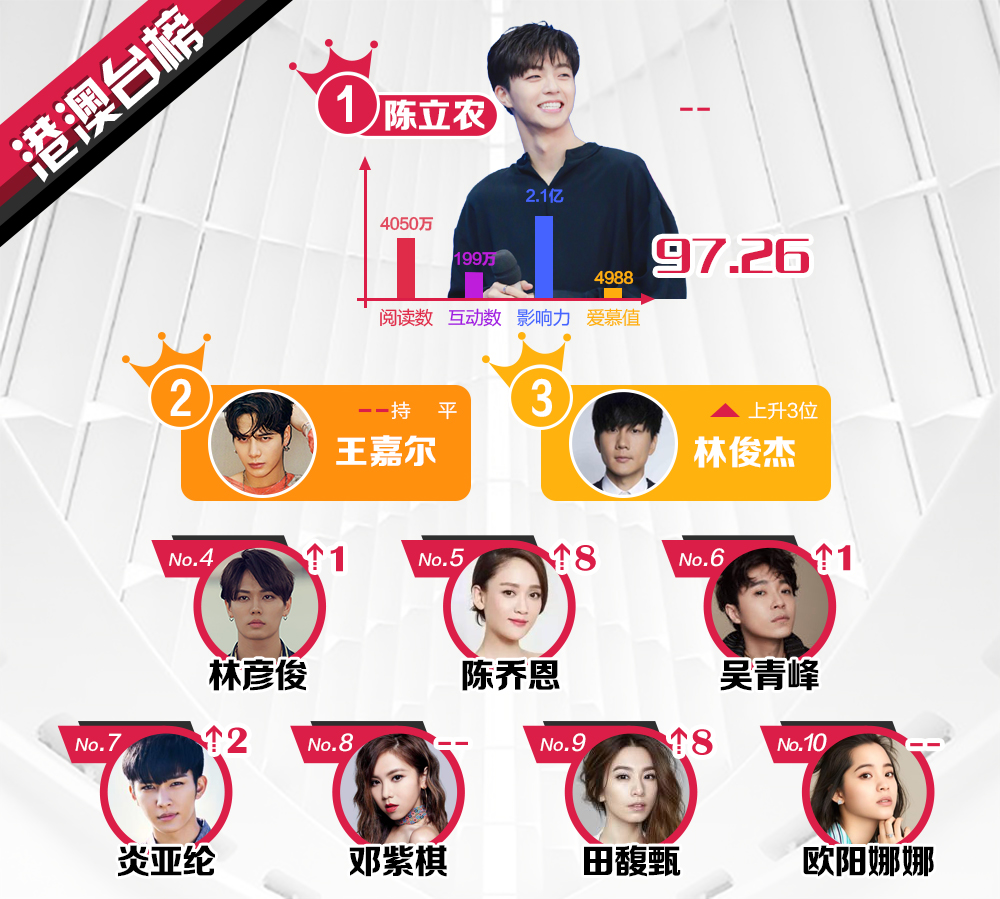 Mới đây, Sina Entertainment đã công bố bảng xếp hạng người nổi tiếng được quan tâm nhất trên mạng xã hội Weibo giữa tháng 2. Các ngôi sao đều từ các khu vực như Trung Quốc, Hồng Kông, Macao - Đài Loan, các quốc gia châu Á - Thái Bình Dương và châu Âu - Hoa Kỳ sẽ có mặt trong danh sách này.