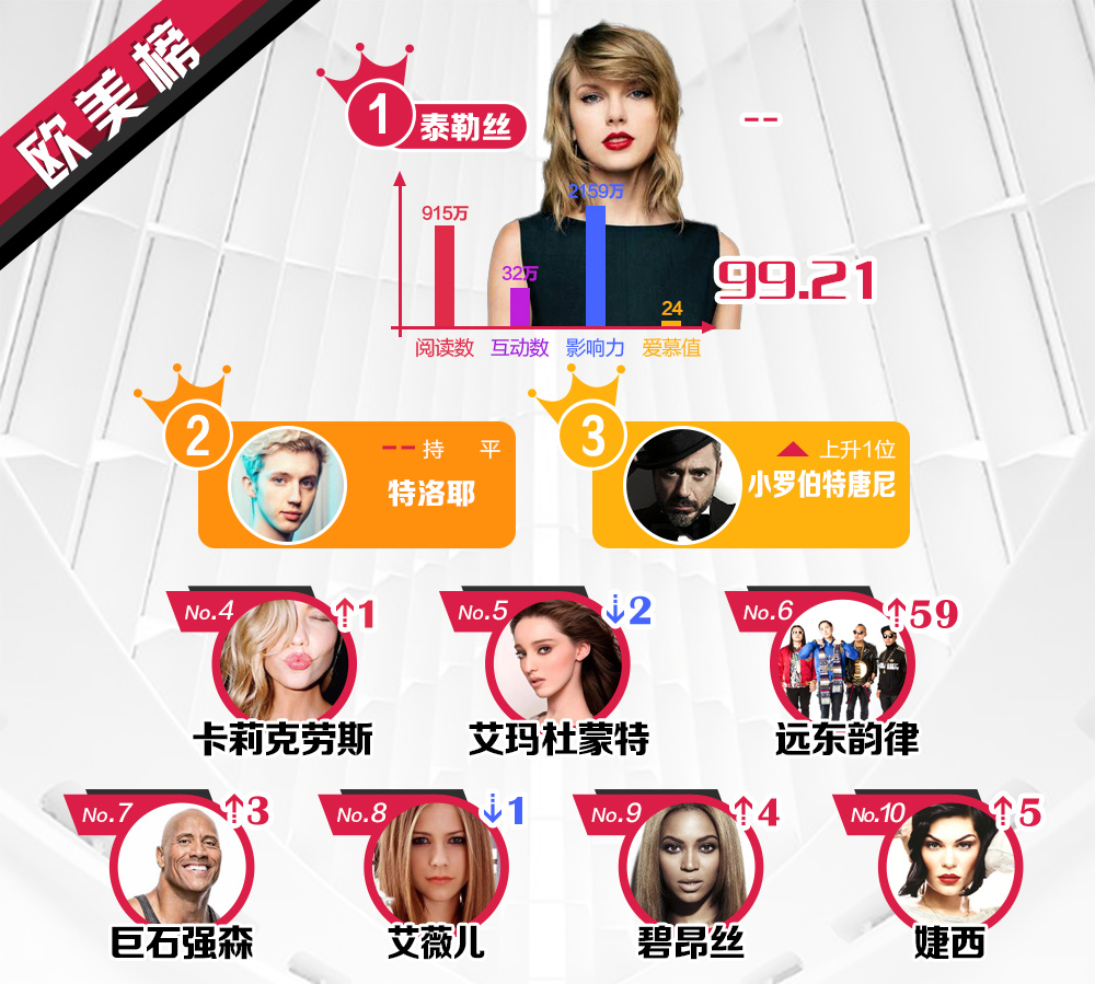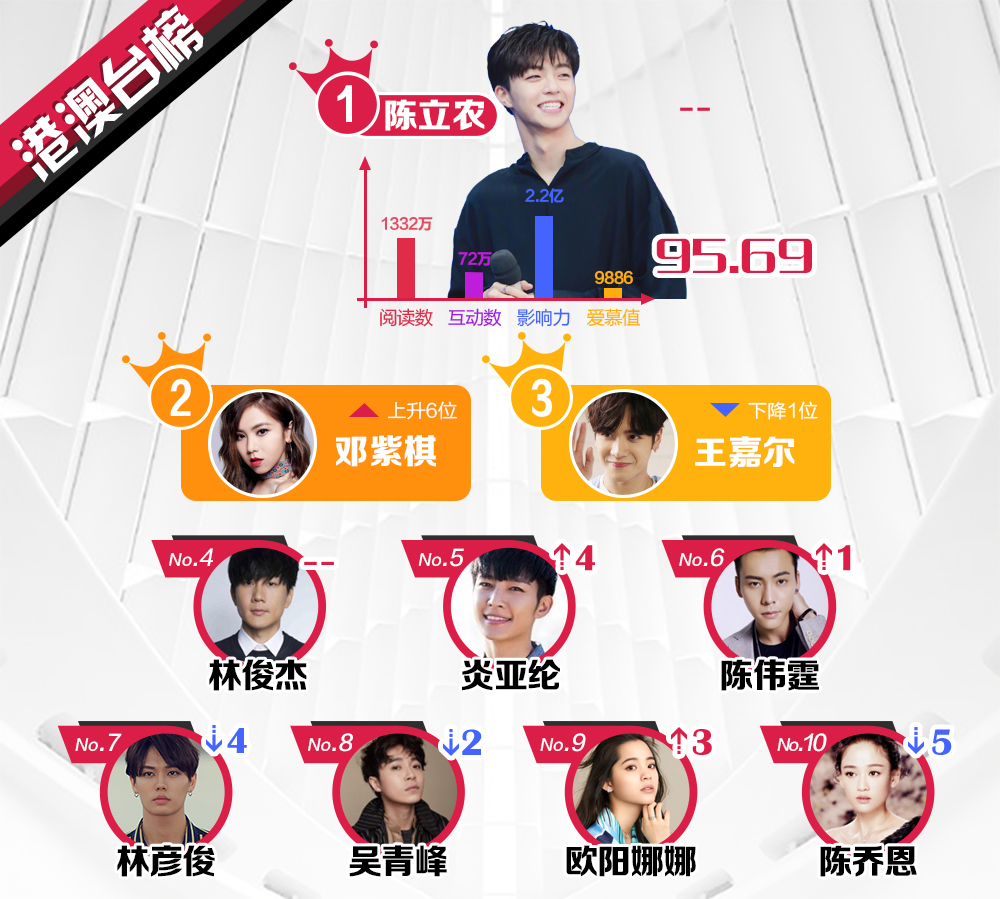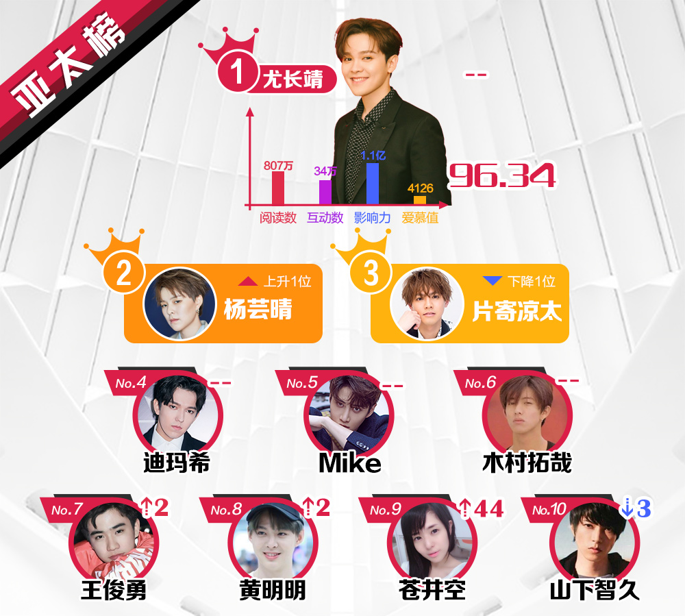 Vừa qua, Sina Entertainment đã công bố bảng xếp hạng nghệ sĩ nổi tiếng được quan tâm nhất trên mạng xã hội Weibo vào tuần 3 tháng 3. Được biết, các ngôi sao đều từ các khu vực như Trung Quốc, Hồng Kông, Macao - Đài Loan, các quốc gia châu Á - Thái Bình Dương và châu Âu - Hoa Kỳ cũng đều có mặt trong danh sách này.