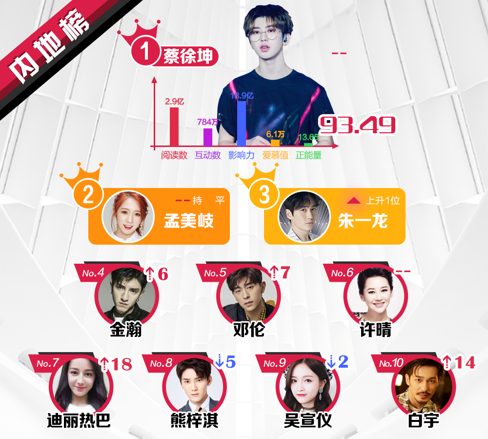 Để có kết quả, ban tổ chức sẽ phân tích và dựa vào tổng số điểm từ chỉ số truyền thông, tương tác, lượt xem, chia sẻ, yêu thích và lượt tìm kiếm, đánh giá trên Weibo từ 13/03 đến hết ngày 18/03. Dưới đây là TOP 10 thần tượng nổi tiếng nhất trong tuần qua: