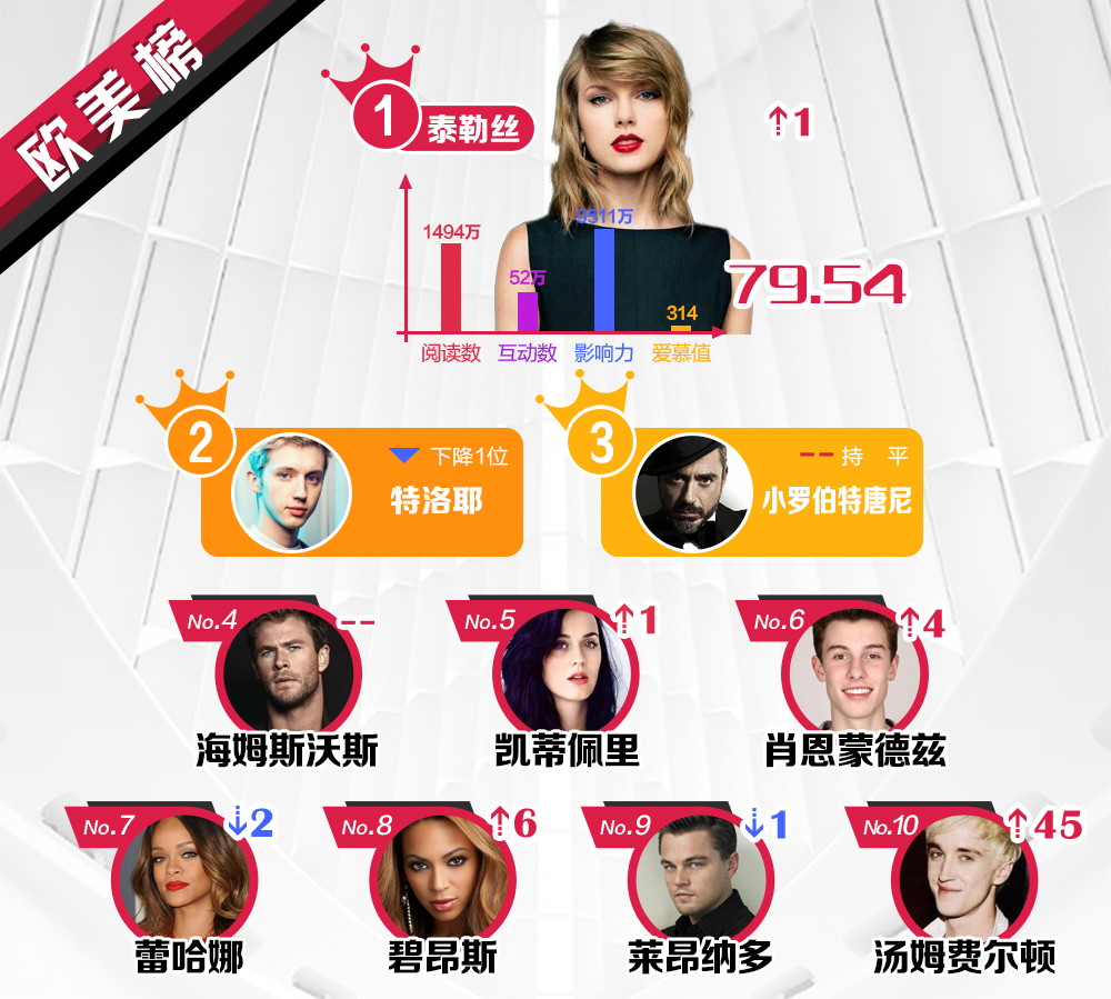 Kết quả dựa trên dữ liệu tìm kiếm, tương tác ở Weibo, thống kê về số lượng, ảnh hưởng xã hội và chỉ số giá trị yêu mến từ người hâm mộ của các nghệ sĩ nổi tiếng trong 1 tuần. Mỗi một số chỉ số sẽ được tích lũy và kết quả cuối cùng sẽ được tổng hợp để đưa ra xếp hạng cuối cùng ở từng khu vực.