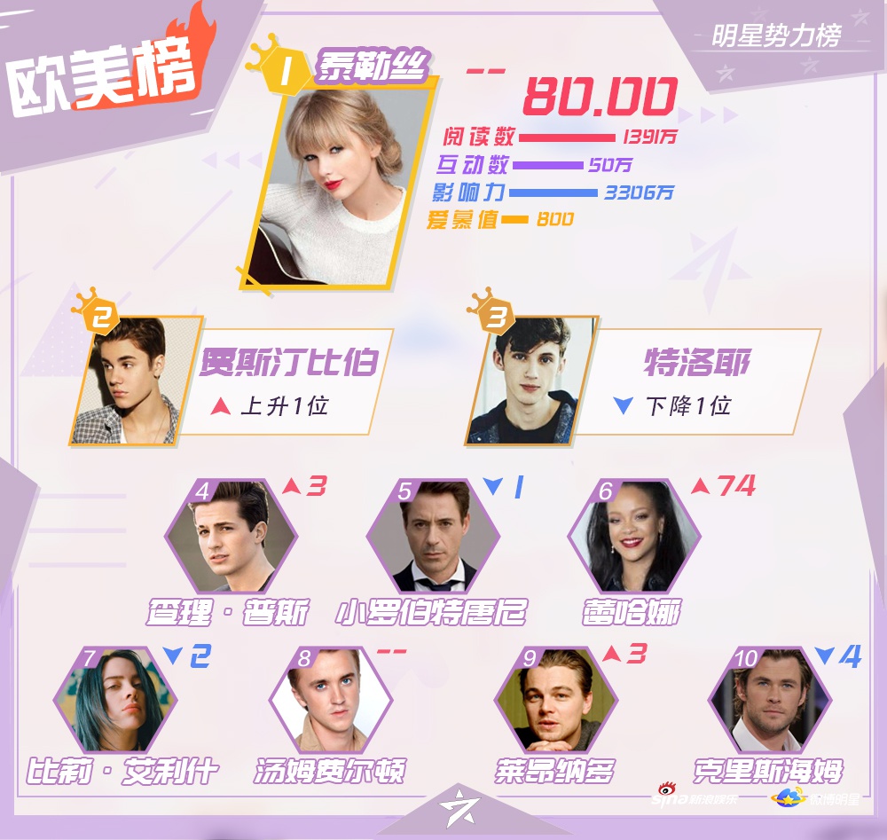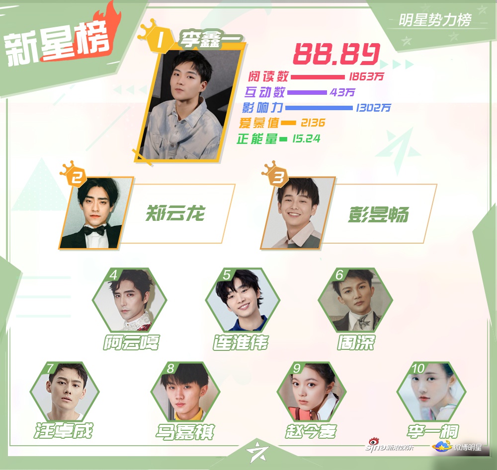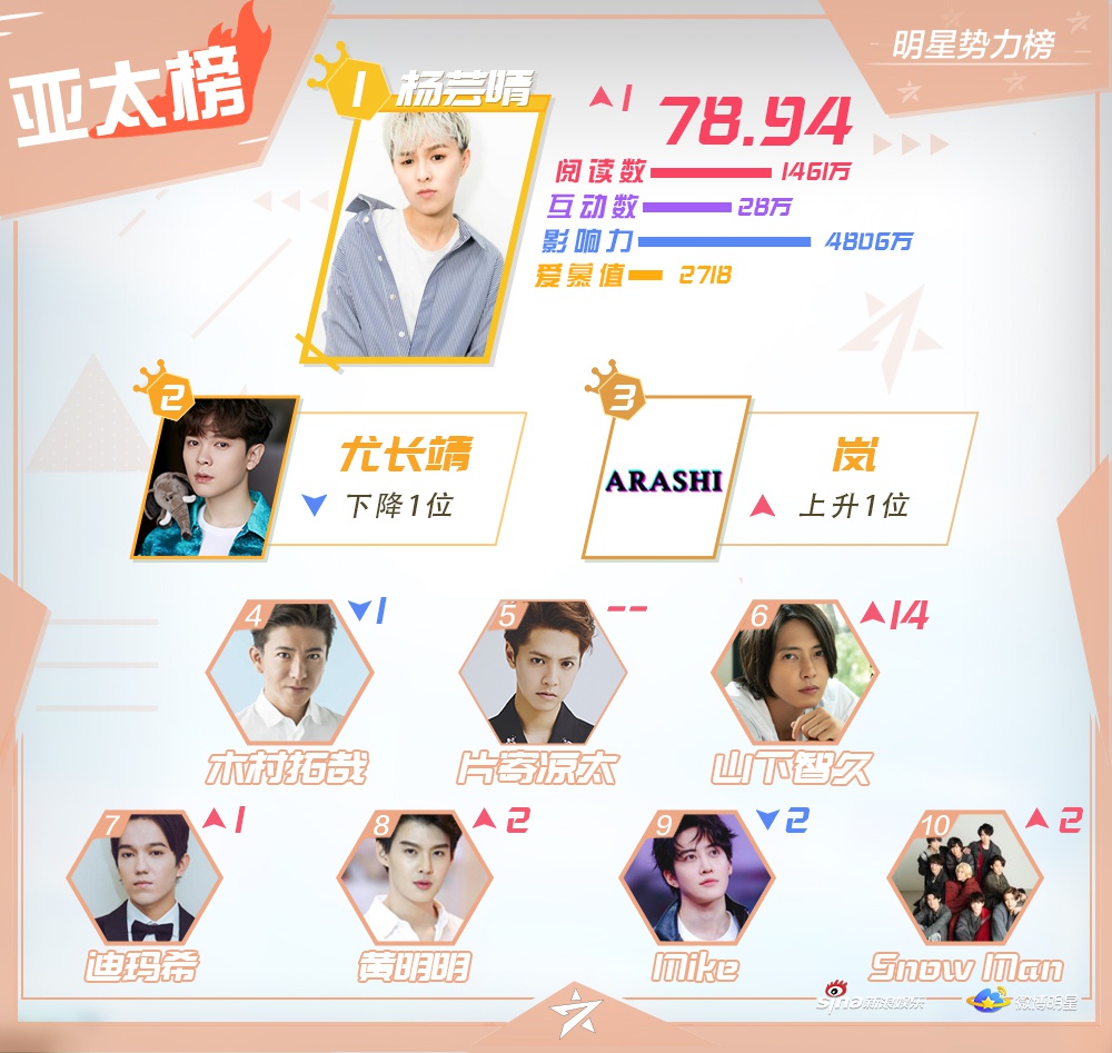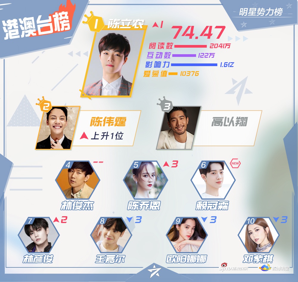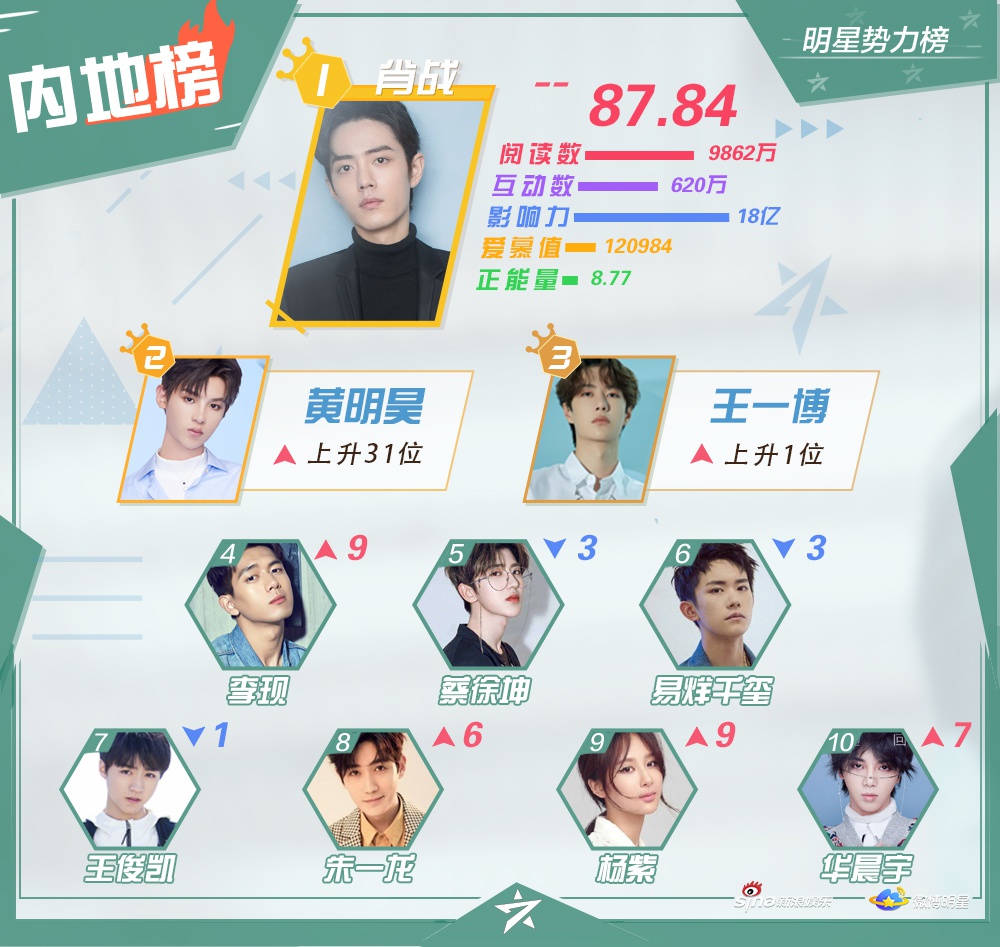 Vào ngày 10/12, Sina Entertainment đã công bốTop 10 những nghệ sĩ nổi tiếng, hiện đang hoạt động ở khu vực Đại Lục Trung Quốc, Hong Kong, Macao - Đài Loan, các quốc gia châu Á - Thái Bình Dương và châu Âu - Hoa Kỳ trên mạng xã hội Weibo vào tuần 2 tháng 12.