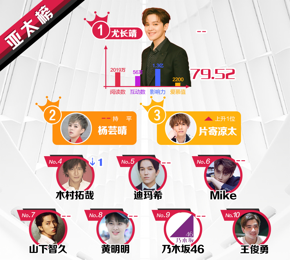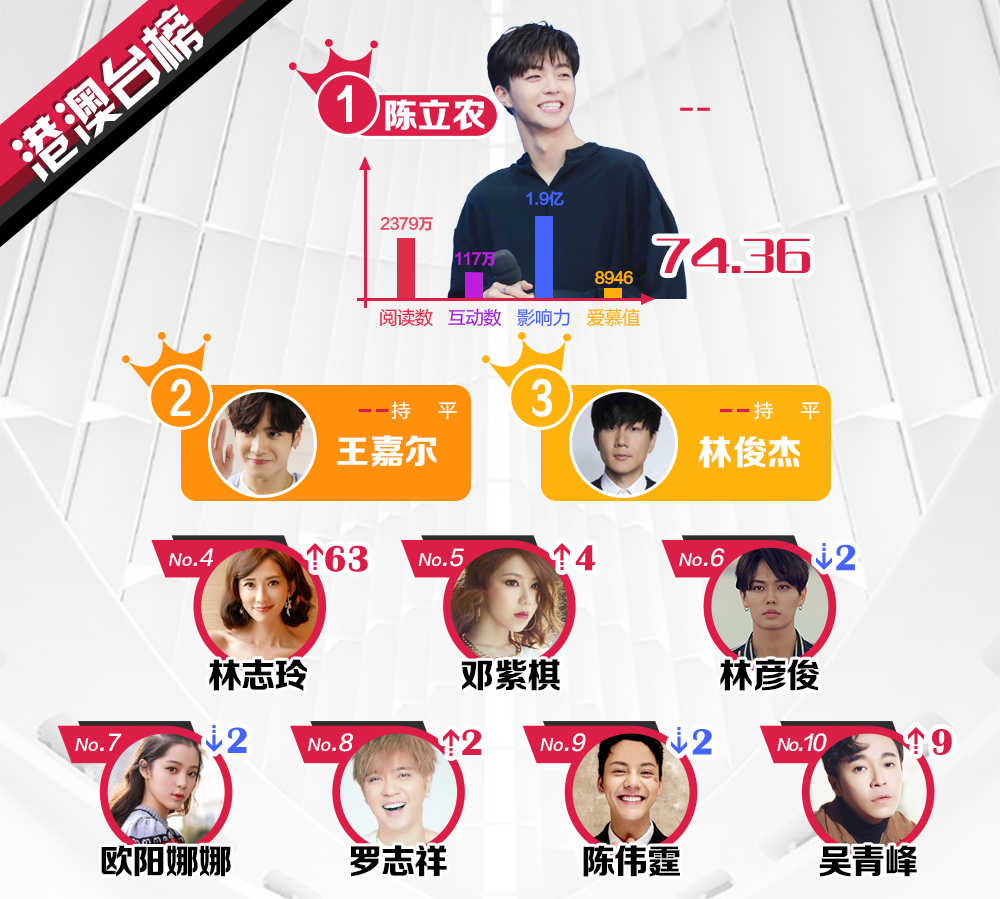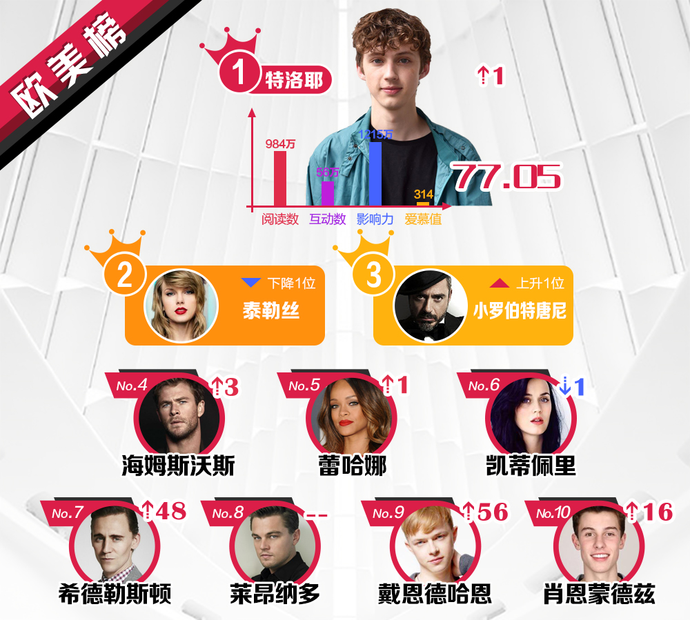 Vào ngày 11/06 vừa qua, Sina đã công bố xếp hạng cho những ngôi sao ở khu vực Đại Lục Trung Quốc, Hong Kong, Macao - Đài Loan, các quốc gia châu Á - Thái Bình Dương và châu Âu - Hoa Kỳ được quan tâm nhất trên mạng xã hội Weibo từ ngày 04/06 đến 10/06.