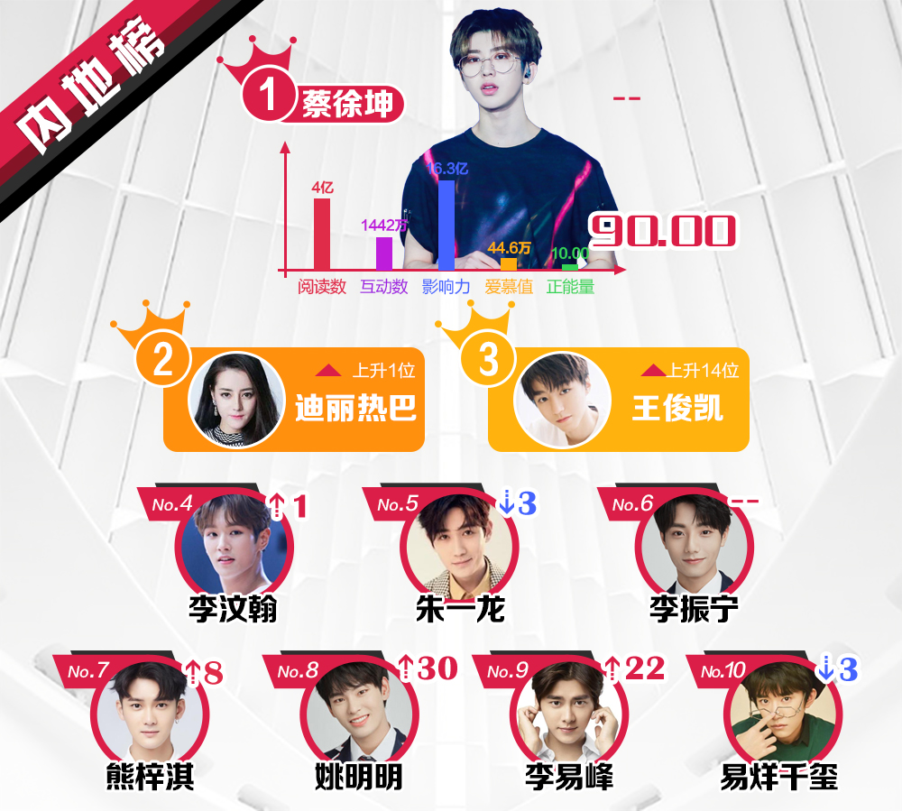 Kết quả dựa trên dữ liệu tìm kiếm, tương tác ở Weibo, thống kê về số lượng, ảnh hưởng xã hội và chỉ số giá trị yêu mến từ người hâm mộ của các nghệ sĩ nổi tiếng trong 1 tuần.