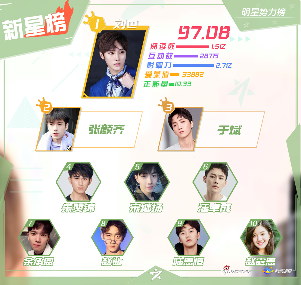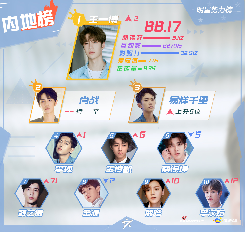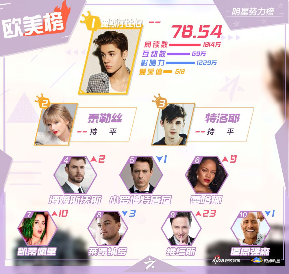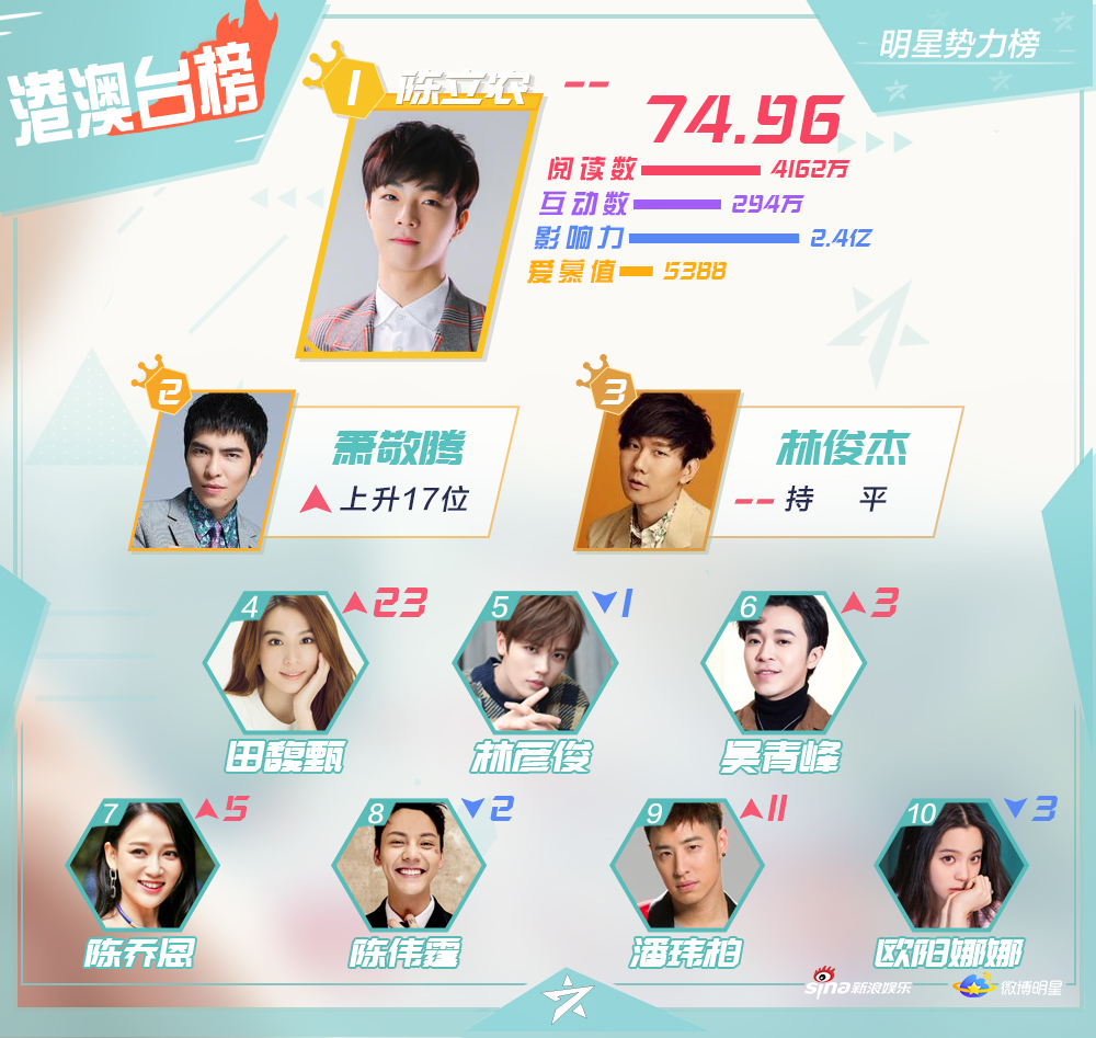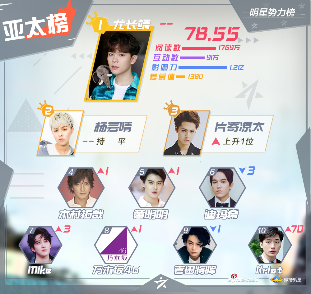 Ngày 13/08 vừa qua, Sina Entertainment đã công bố Top 10 những nghệ sĩ nổi tiếng, hiện đang hoạt động ở khu vực Đại Lục Trung Quốc, Hong Kong, Macao - Đài Loan, các quốc gia châu Á - Thái Bình Dương và châu Âu - Hoa Kỳ trên mạng xã hội Weibo.