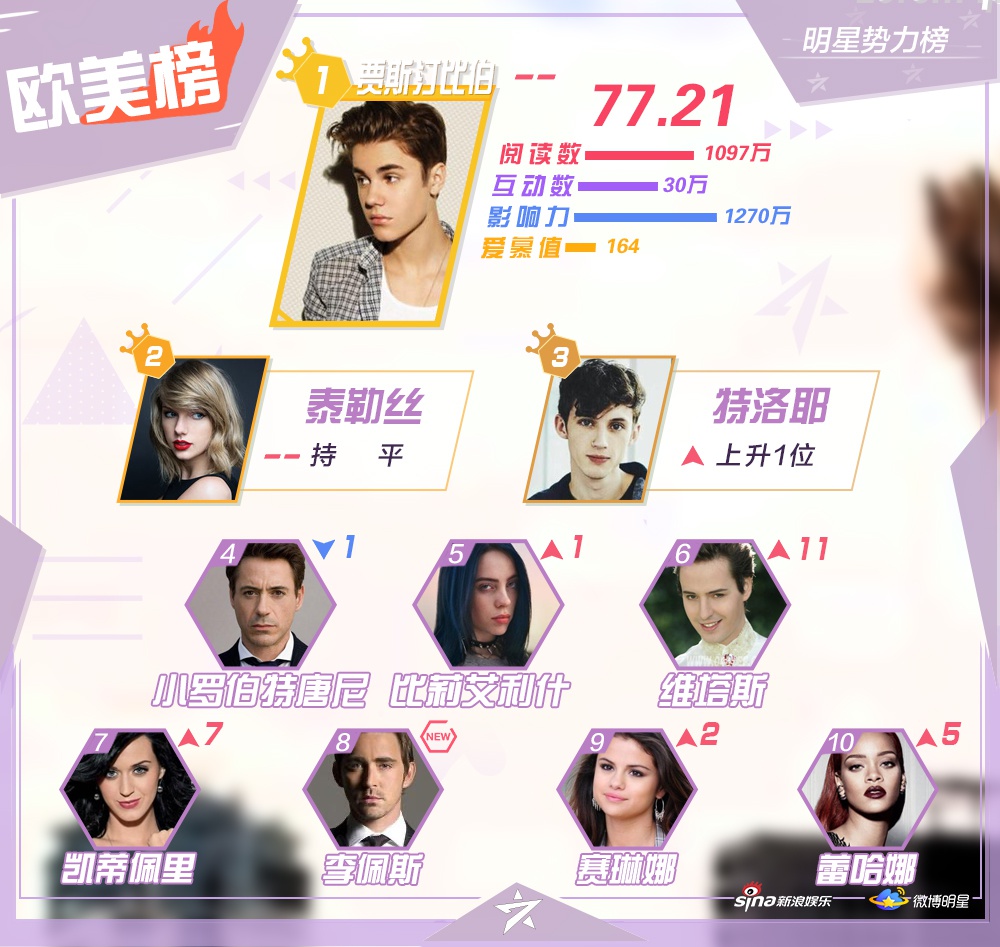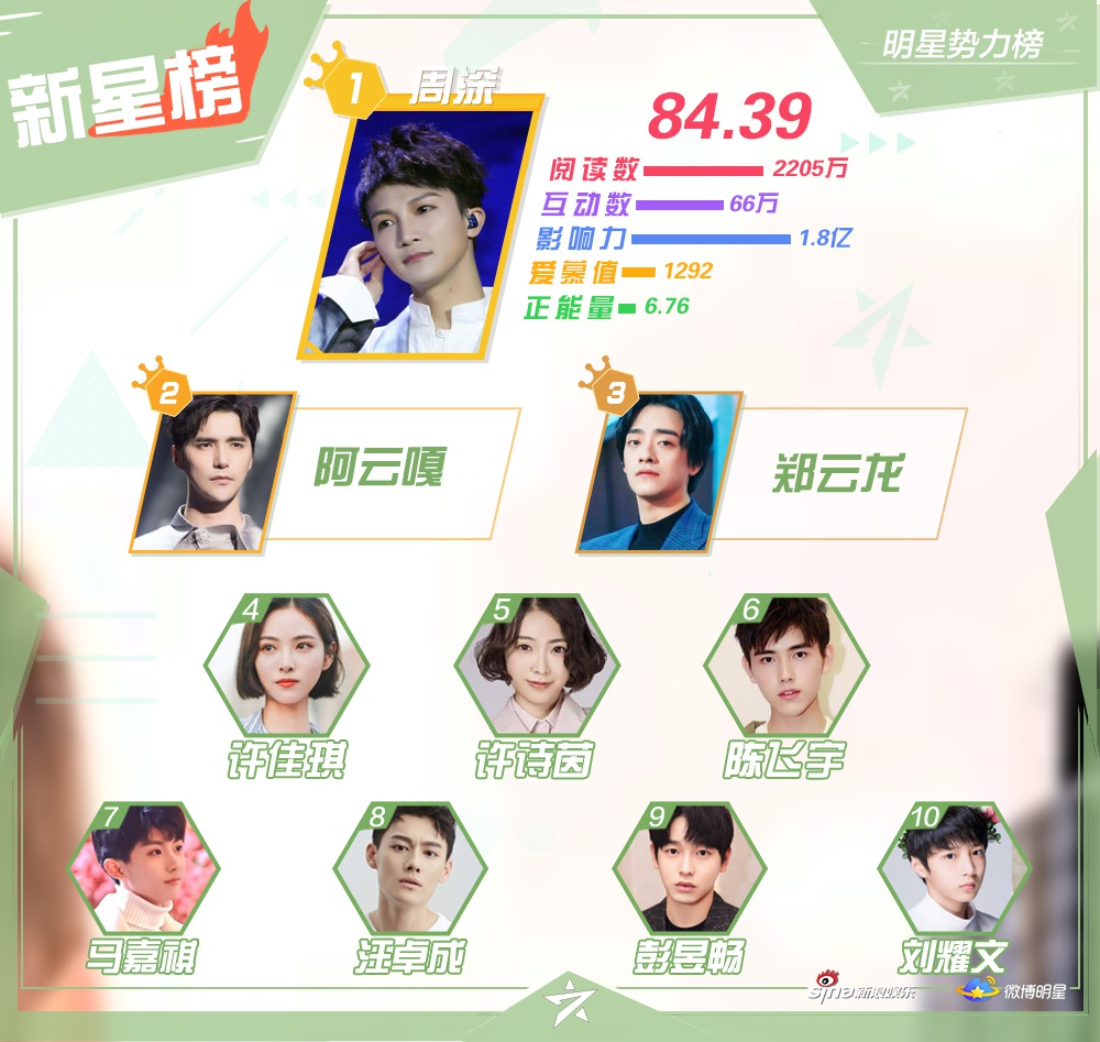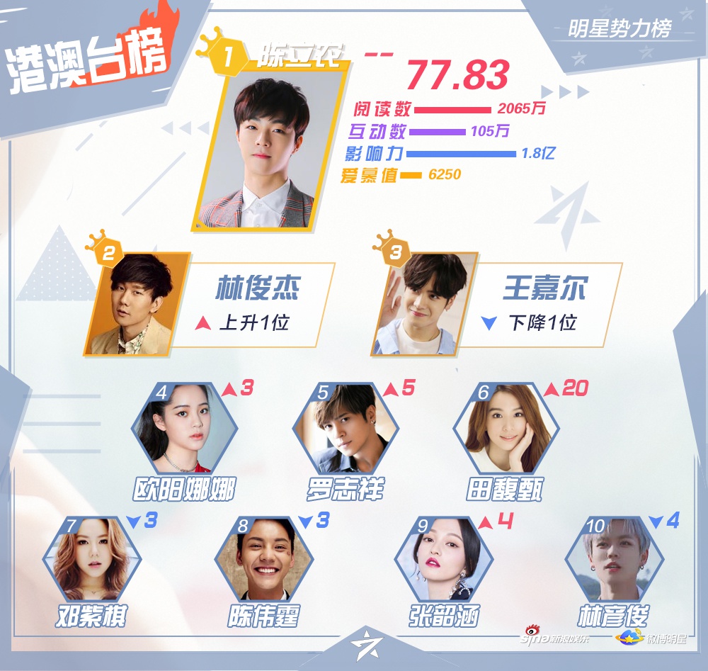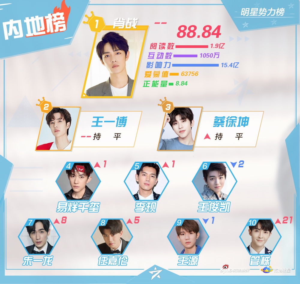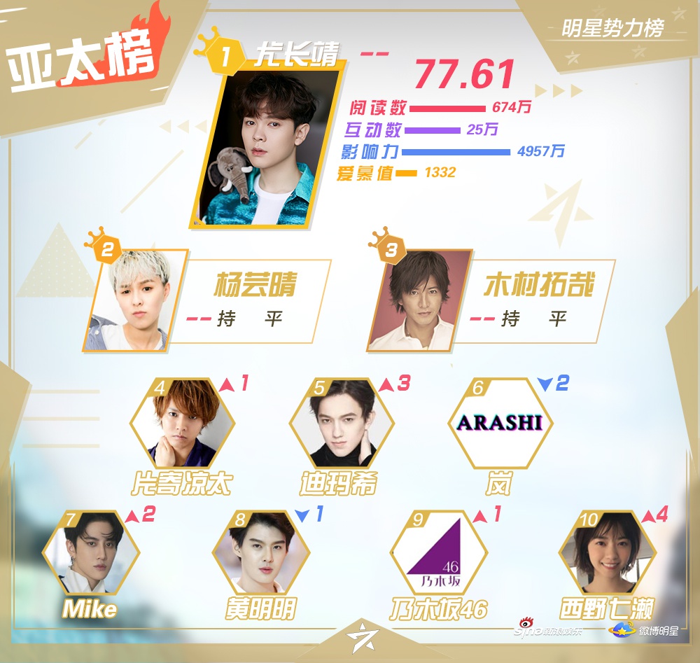 Vào ngày 21/01 vừa qua, Sina Entertainment đã công bố Top 10 những nghệ sĩ nổi tiếng, hiện đang hoạt động ở khu vực Đại Lục Trung Quốc, Hong Kong, Macao - Đài Loan, các quốc gia châu Á - Thái Bình Dương và châu Âu - Hoa Kỳ trên mạng xã hội Weibo vào tuần ba của tháng 01/2020.