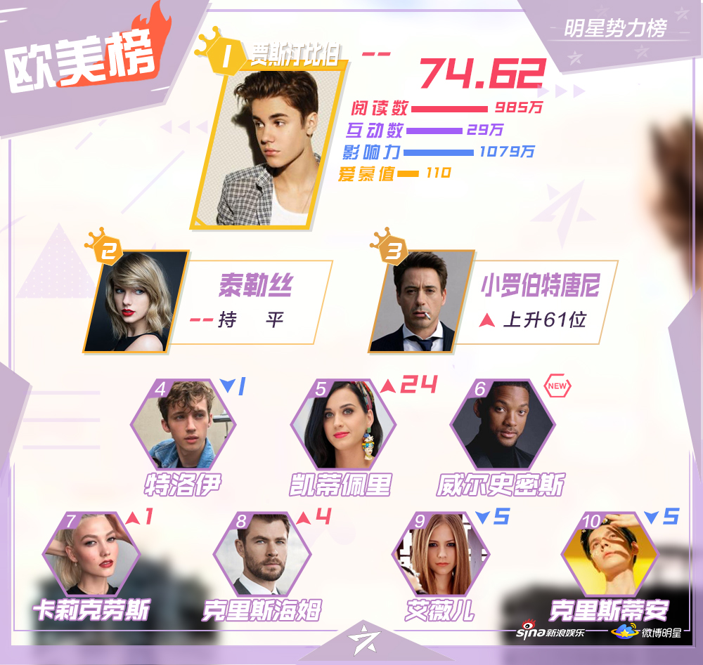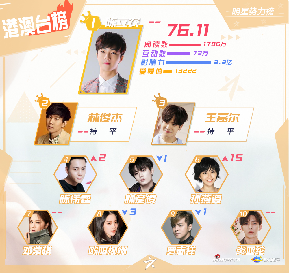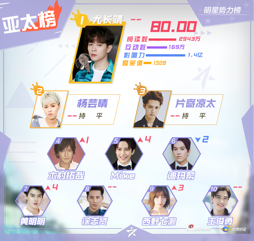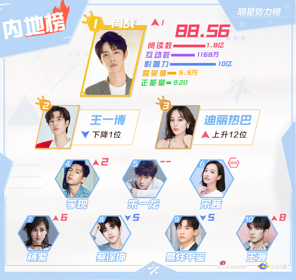 Vào ngày 22/10 vừa qua, Sina Entertainment đã tiết lộ Top 10 những nghệ sĩ nổi tiếng, hiện đang hoạt động ở khu vực Đại Lục Trung Quốc, Hong Kong, Macao - Đài Loan, các quốc gia châu Á - Thái Bình Dương và châu Âu - Hoa Kỳ trên mạng xã hội Weibo vào tuần 3 tháng 9.