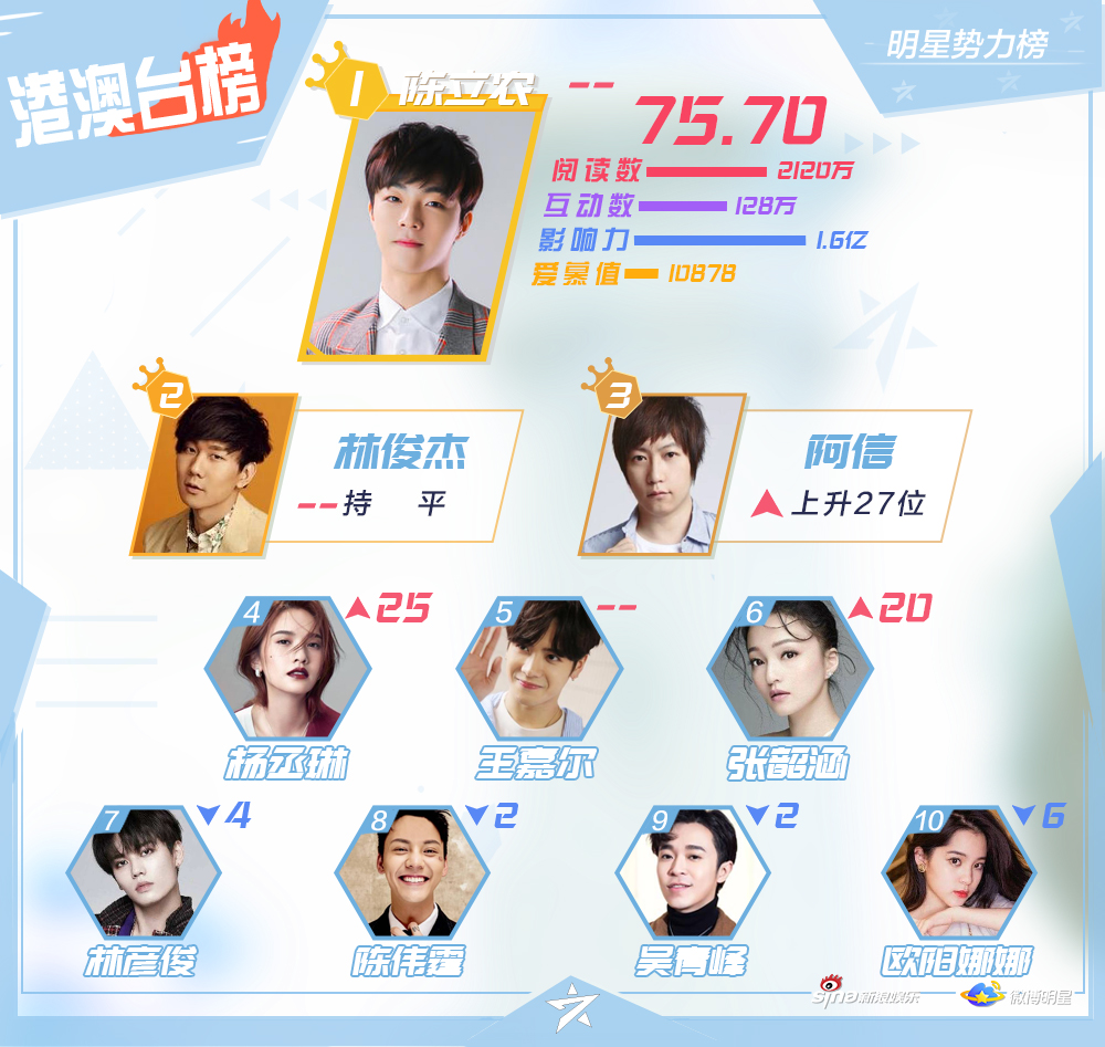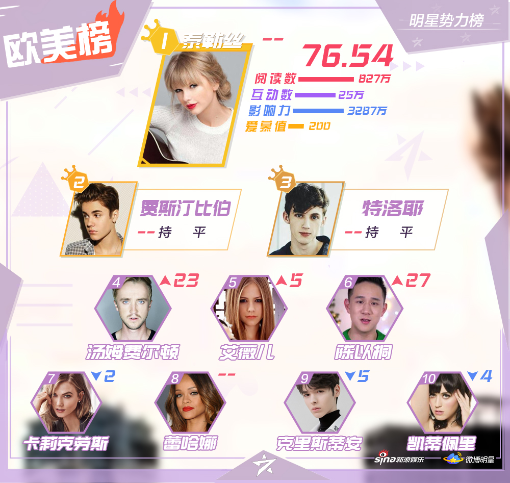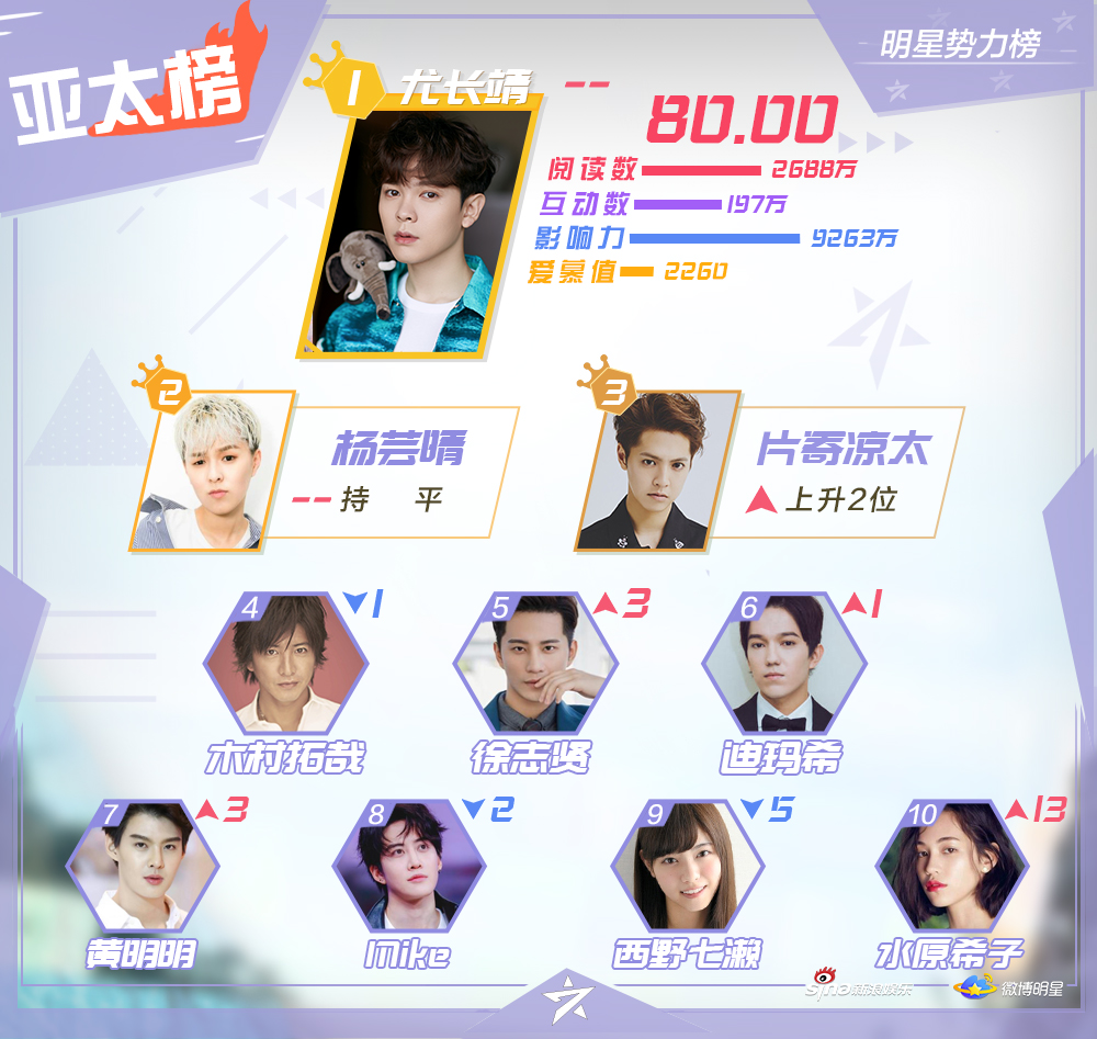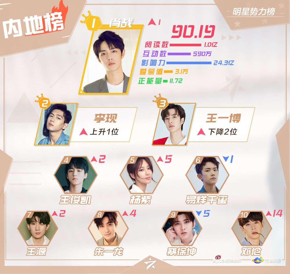 Ngày 24/09 vừa qua, Sina Entertainment đã tiết lộ Top 10 những nghệ sĩ nổi tiếng, hiện đang hoạt động ở khu vực Đại Lục Trung Quốc, Hong Kong, Macao - Đài Loan, các quốc gia châu Á - Thái Bình Dương và châu Âu - Hoa Kỳ trên mạng xã hội Weibo vào khoảng tuần 3 tháng 9.