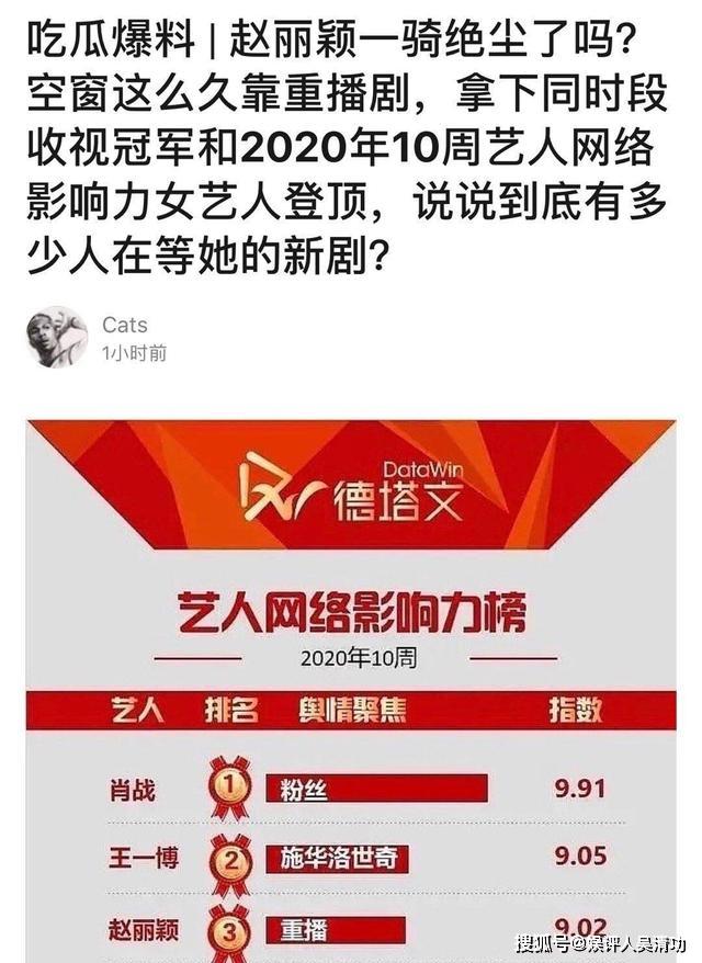 Triệu Lệ Dĩnh có thể xuất hiện trong bảng xếp hạng lần này, trở thành Nữ nghệ sỹ có sức ảnh hưởng nhất nhờ vào các bộ phim cũ được phát sóng lại trên các đài truyền hình. Nàng tiểu hoa có rất nhiều phim trở thành kinh điển, thường xuyên được chiếu trên các đài truyền hình lớn như Lục Trinh truyền kỳ chiếu lại vào buổi sáng trên đài Hồ Nam, rating dẫn đầu, cao hơn An gia của Tôn Lệ.