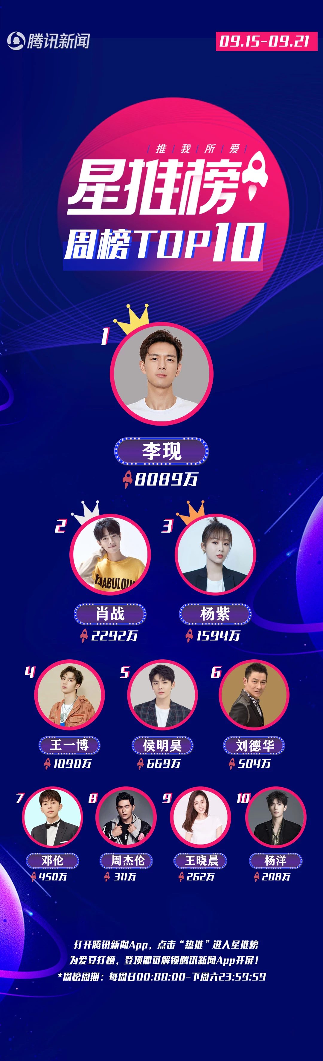 BXH sức nóng Ngôi sao tin tức Tencent tuần thứ 12 được tung ra: Lý Hiện là minh tinh dẫn đầu với độ hot đạt đến 80,890 triệu. Tiêu Chiến với 22,92 triệu đứng ở vị trứ thứ 2 và Dương Tử với 15,94 đạt vị trí thứ 3.