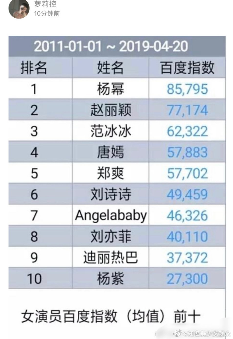 Mới đây, Bảng xếp hạng chỉ số baidu Nữ diễn viên từ năm 2011-2019 được đăng tải gồm: