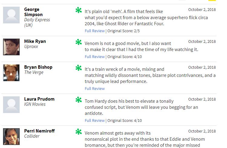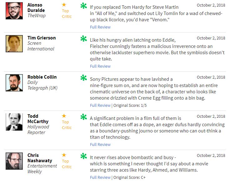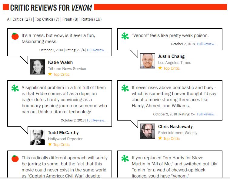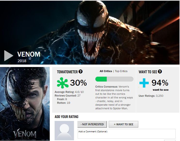 Rotten Tomatoes vừa cập nhật điểm số trên trang web của họ đối với phim điện ảnh Venom - sẽ khởi chiếu trong tuần này. 30% chắc chắn là điều không một fan nào của nhân vật này mong muốn, tuy nhiên điều đó đang diễn ra. Ở thời điểm hiện tại, bộ phim bị gắn mác “cà chua thối” với phần lớn review đều rất tiêu cực. Để có thể đạt chứng nhận “fresh” (tươi), Venom gần phải có ít nhất 75% review tích cực, và khoảng 80 review.