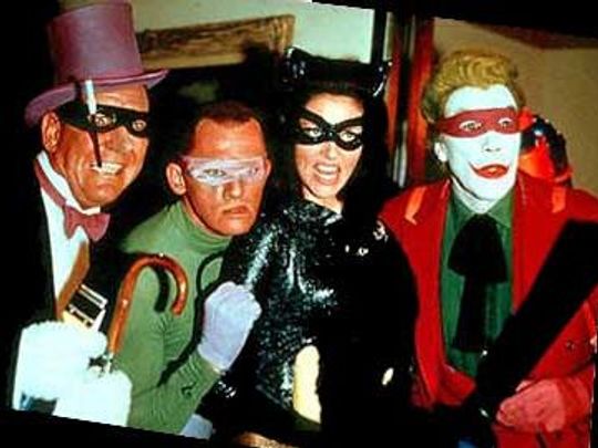 Batman: The Movie là bộ phim ăn khách của truyền hình trại hè thập niên 1960 với sự tham gia của Adam West trong vai Batman và Burt Ward trong vai Robin. Tuy nhiên, chính những nhân vật phản diện mới làm nên thành công của bộ phim. Từ trái qua là Burgess Meredith trong vai The Penguin, Frank Gorshin trong vai The Riddler, Lee Meriwether trong vai Catdess và Cesar Romero trong vai The Joker.