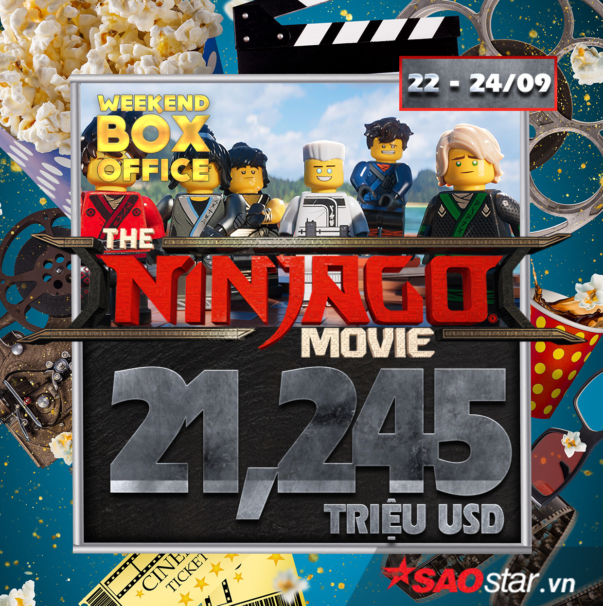Cùng ra mắt tuần này, The Lego Ninjago Movie thu được 21 triệu USD. Đây không hề là con số nhỏ nhưng vẫn bị lép vế hẳn so với 2 đại bom tấn Kingsman 2 và It. Bộ phim giữ vị trí số 3 và thấp hơn doanh thu dự kiến mà nhà sản xuất mong đợi. Bên cạnh đó, tại thị trường quốc tế, bộ phim lấy đề tài về Lego cũng thu được 10,5 triệu USD tại 37 khu vực, trong đó Nga dẫn đầu với 1,7 triệu USD, theo sau là Đức (1,4 triệu USD), Ba Lan (803 ngàn USD), Úc (800 ngàn USD)…