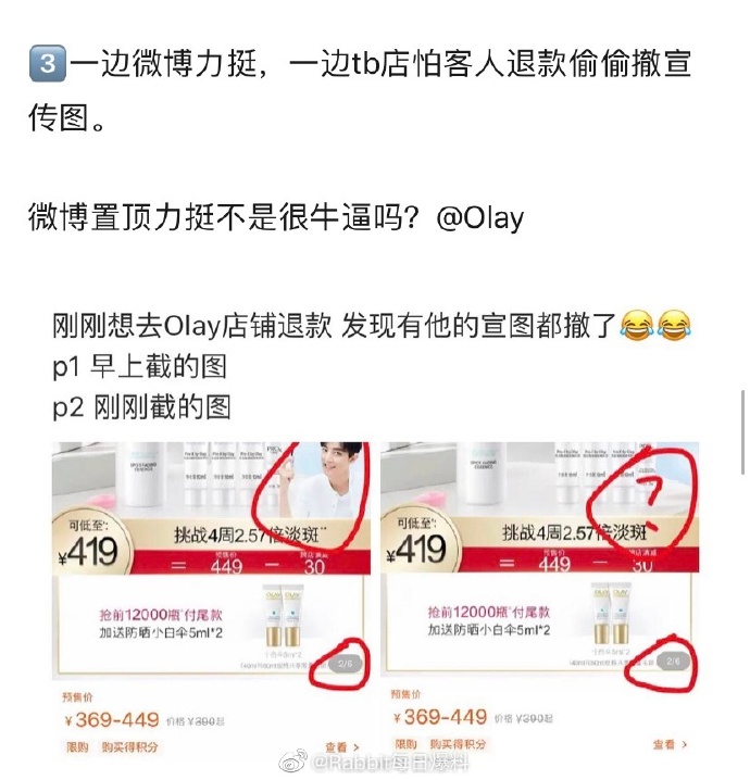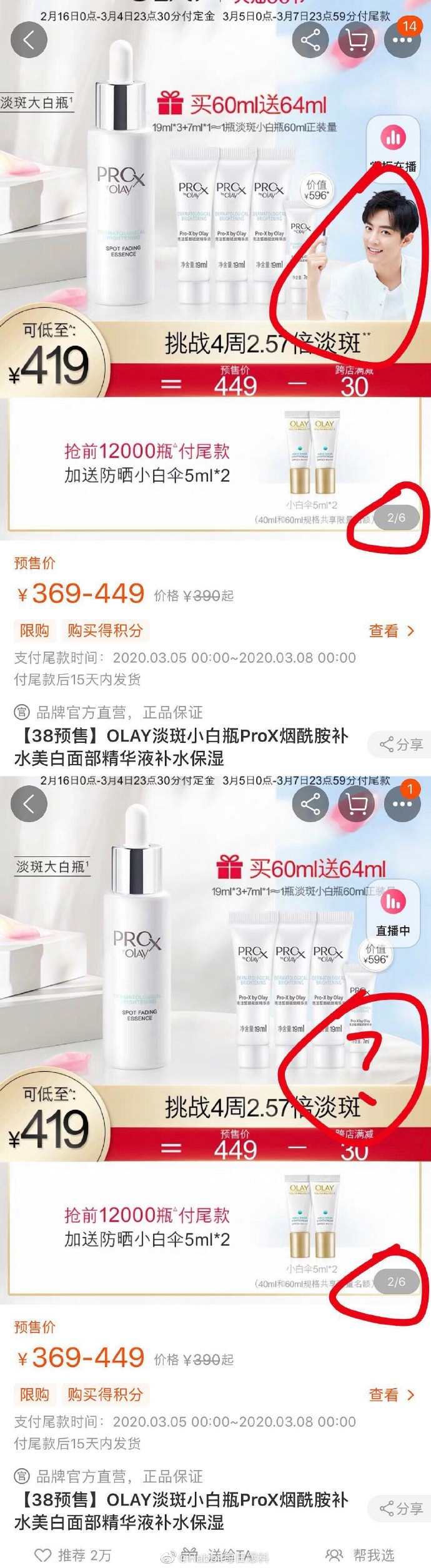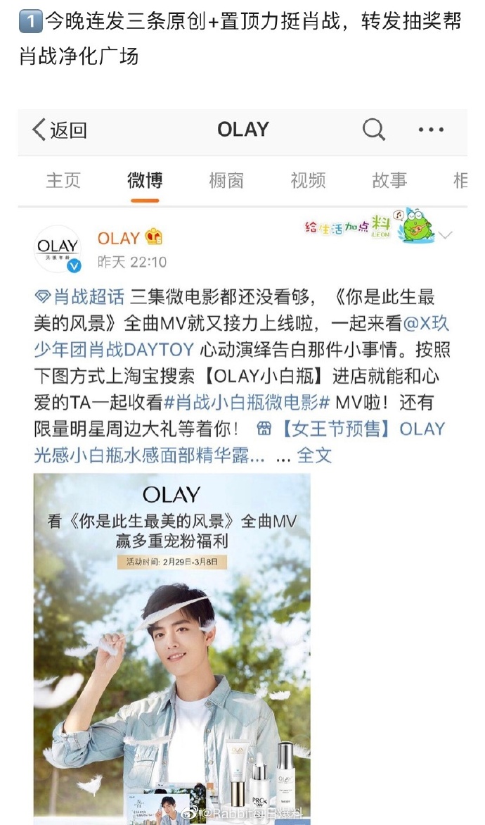 Tiếp đến, nhãn hàng Olay hợp tác cùng Tiêu Chiến cũng xuất hiện động thái “bỏ người chạy lấy của”. Weibo thương hiệu dời bài viết quảng bá về Tiêu Chiến từng được ghim đầu tài khoản xuống, thay vào đó đưa bài đăng về Mã Tư Thuần lên thay thế. Tất cả những quảng cáo Olay của Tiêu Chiến đều bị thương hiệu xóa bỏ toàn bộ.