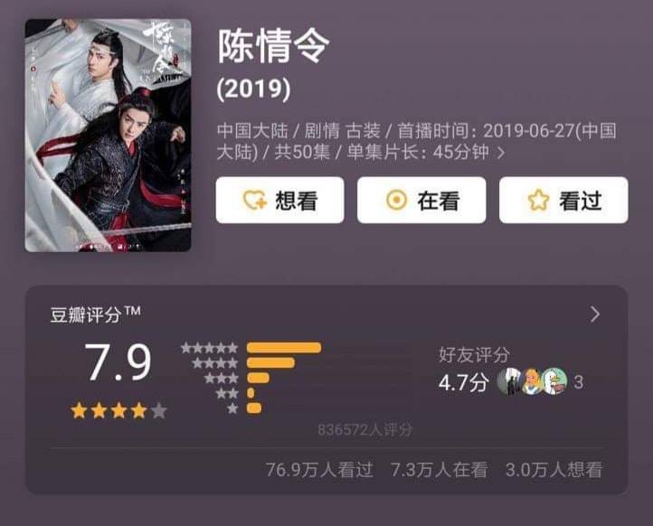Chỉ cần phim nào có liên quan đến Tiêu Chiến, ắt hẳn điểm số trên Douban sẽ tụt xuống không phanh. Từ khuya qua đến nay, Trần tình lệnh hứng chịu cơn mưa chỉ trích, mắng chửi nặng nề nhất. Đây cũng là tác phẩm giúp Tiêu Chiến nổi tiếng như ngày hôm nay, nên nó chịu ảnh hưởng nhiều nhất cũng là chuyện dễ hiểu. Điểm số trên Douban của Trần tình lệnh giảm từ 8,2 giảm xuống còn 7.9 điểm với hơn 100 ngàn người bình chọn mới đồng loạt đánh giá 1 sao.
