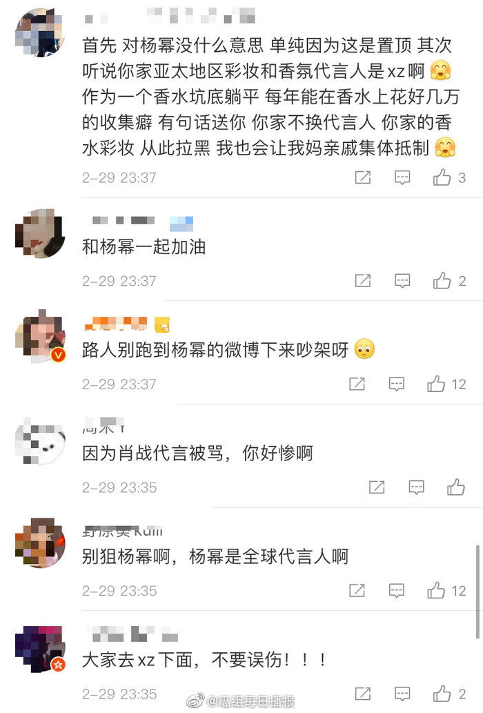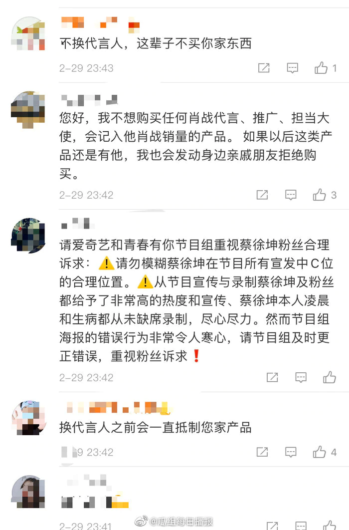 Từ tối khuya ngày hôm qua (29.02), rất nhiều cư dân mạng đến tài khoản Weibo chính thức của thương hiệu nổi tiếng Estée Lauder Companies hay các sản phẩm khác do Tiêu Chiến làm đại diện, đồng loạt bình luận, lên tiếng tẩy chay, từ chối mua hàng đến khi nào họ đổi người đại diện mới: “Không muốn mua bất kỳ sản phẩm nào liên quan đến Tiêu Chiến. Tôi sẽ ghi nhớ những sản phẩm có lượng tiêu thụ của anh ta. Nếu như sau này, những loại sản phẩm này còn có Tiêu Chiến thì tôi sẽ vận động bạn bè thân thích không mua hàng nữa”, “Thần tượng nên chịu trách nhiệm trước hành vi của fan hâm mộ, không mua sản phẩm do Tiêu Chiến làm đại diện”.