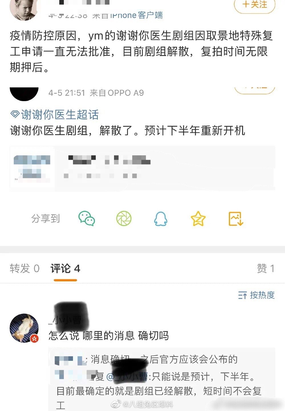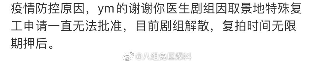 Tối ngày 05.04, trên mạng Weibo xuất hiện thông tin cho biết: “Với lý do phòng chống dịch bệnh, đoàn phim Cảm ơn bác sỹ của Dương Mịch không được phê duyệt đơn xin trở lại công việc vì địa điểm quay, bối cảnh đặc thù. Trước mắt, ekip giải tán, thời gian quay lại bị hoãn vô thời hạn”.