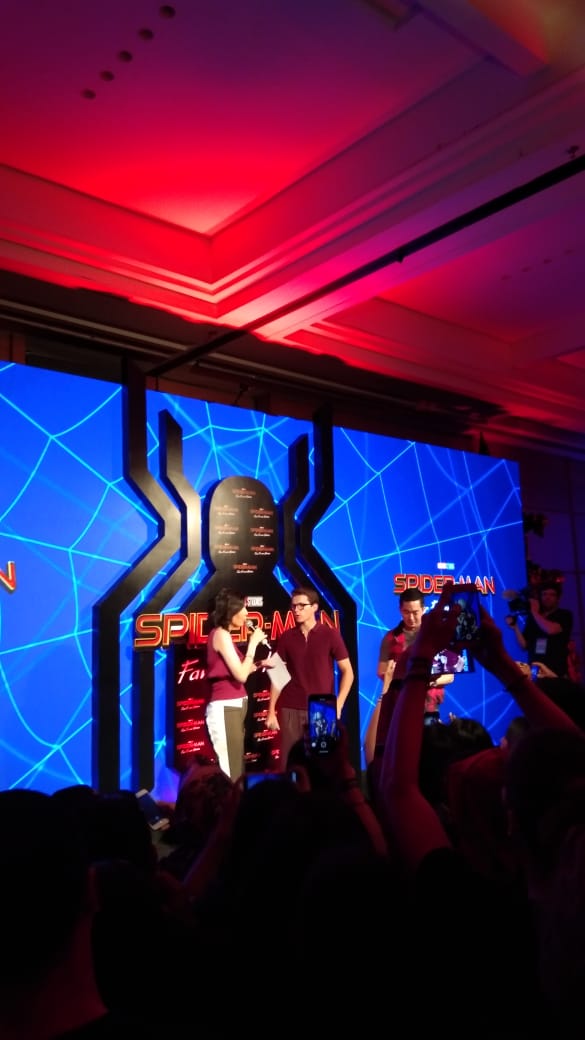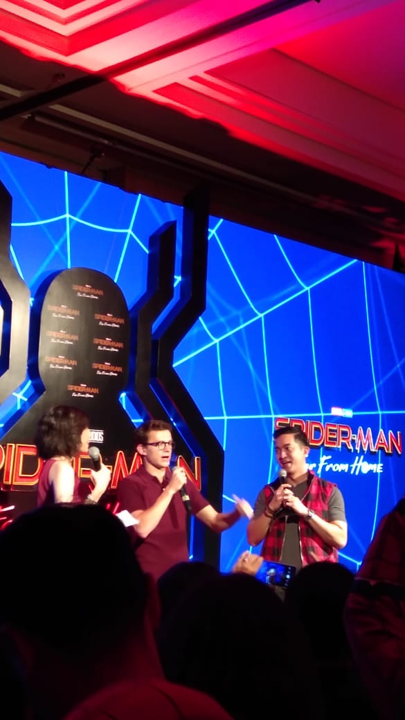 Hai MC của sự kiện đã hỏi một số câu hỏi xoay quanh bộ phim Spider-man: Far From Home. Theo đó, vai trò Mysterio như thế nào trong phim vẫn là nỗi tò mò của nhiều người. Tom Holland cho biết, Mysterio sẽ là người bạn thân nhất của anh. Sau cú búng tay của Thanos đã tạo ra đa vũ trụ (multiverse) khiến cho Mysterio xuất hiện và đến Trái Đất của Peter Parker, nhưng trước đó, các sinh vật trong nhóm Elemental cũng kéo đến. Mặc cho giả thuyết này đã được đạo diễn xác nhận nhưng có vẻ như Tom Holland không biết, nên nghĩ rằng mình vừa trót spoil nội dung phim.