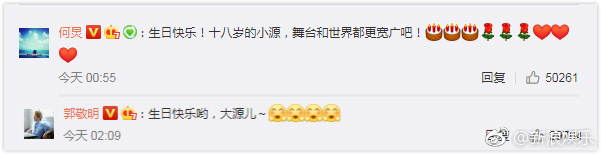 Người dẫn chương trình Hà Cảnh: “Chúc mừng sinh nhật! Tiểu Nguyên 18 tuổi đến với sân khấu và thế giới rộng lớn hơn”. Nhà văn Quách Kính Minh: “Chúc mừng sinh thần em. Tiểu Nguyên nhi”.