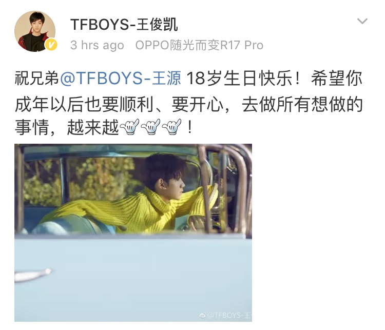 Vương Tuấn Khải chia sẻ: “Chúc người anh em @Vương Nguyên sinh nhật tuổi 18 vui vẻ, hy vọng mọi chuyện sẽ luôn thuận lợi với em, hãy luôn vui vẻ, và làm những việc mình muốn nhé, càng ngày càng ???”. ( Dấu hiệu Shaka: ăn mừng chiến thắng, sự thành công).