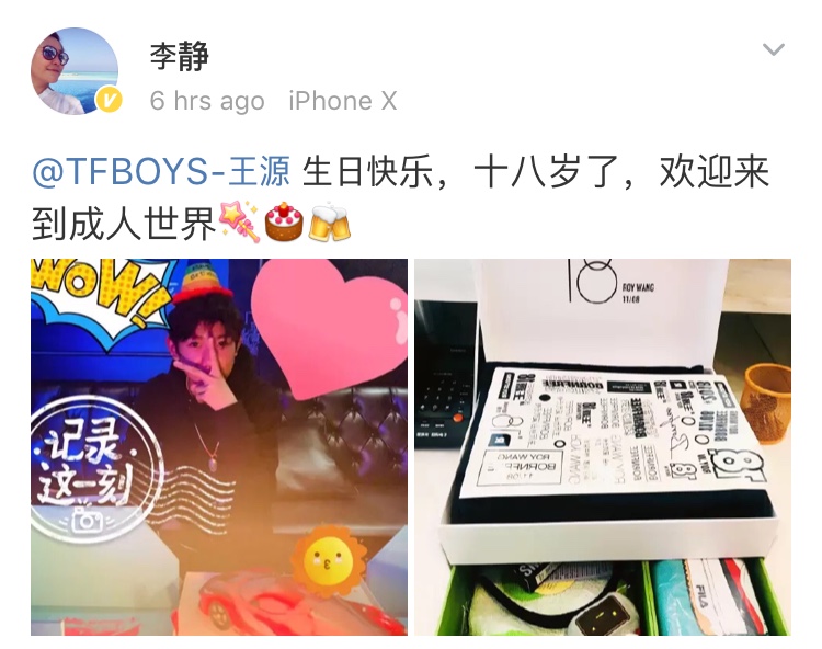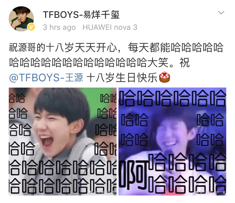 Dịch Dương Thiên Tỉ: “Chúc Nguyên Ca tuổi 18 hạnh phúc mỗi ngày, ngày nào cũng có thể cười hahahahahahahahaha. Nguyên Ca @Vương Nguyên sinh nhật tuổi 18 vui vẻ nha”.