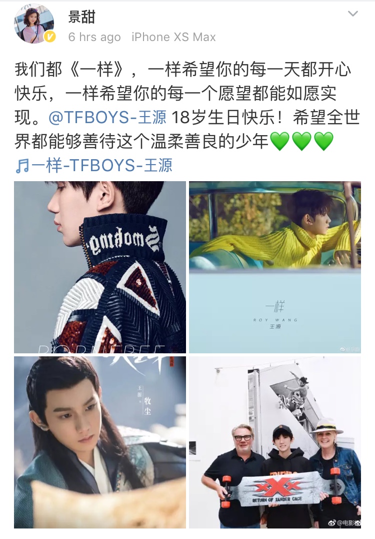 Cảnh Điềm nhắn gửi: “Chúng ta đều “giống nhau”, chị hy vọng rằng em sẽ được hạnh phúc mỗi ngày, và mong sao cho mọi mong muốn của em sẽ thành hiện thực. @Vương Nguyên, chúc mừng sinh nhật lần thứ 18!. Tôi hy vọng rằng cả thế giới có thể đối xử tử tế với cậu bé dịu dàng và tốt bụng này”.