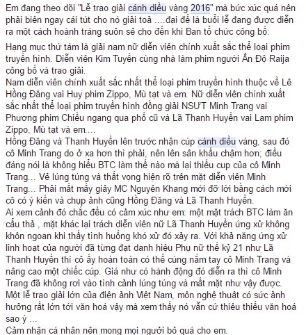 Hàng loạt khán giả ngày hôm ấy đã thể hiện sự bức xúc tột cùng trên trang cá nhân. Có vẻ như ấn tượng trong đầu họ về Cánh Diều 2016 chỉ là sai và sai. Từ “đọc sai tên người nhận giải”, “không nhớ tên lên trao giải” cho đến việc cảm thấy “sai sai” một số giải thưởng, BTC dường như đã không tránh được bất cứ lời phàn nàn nào.
