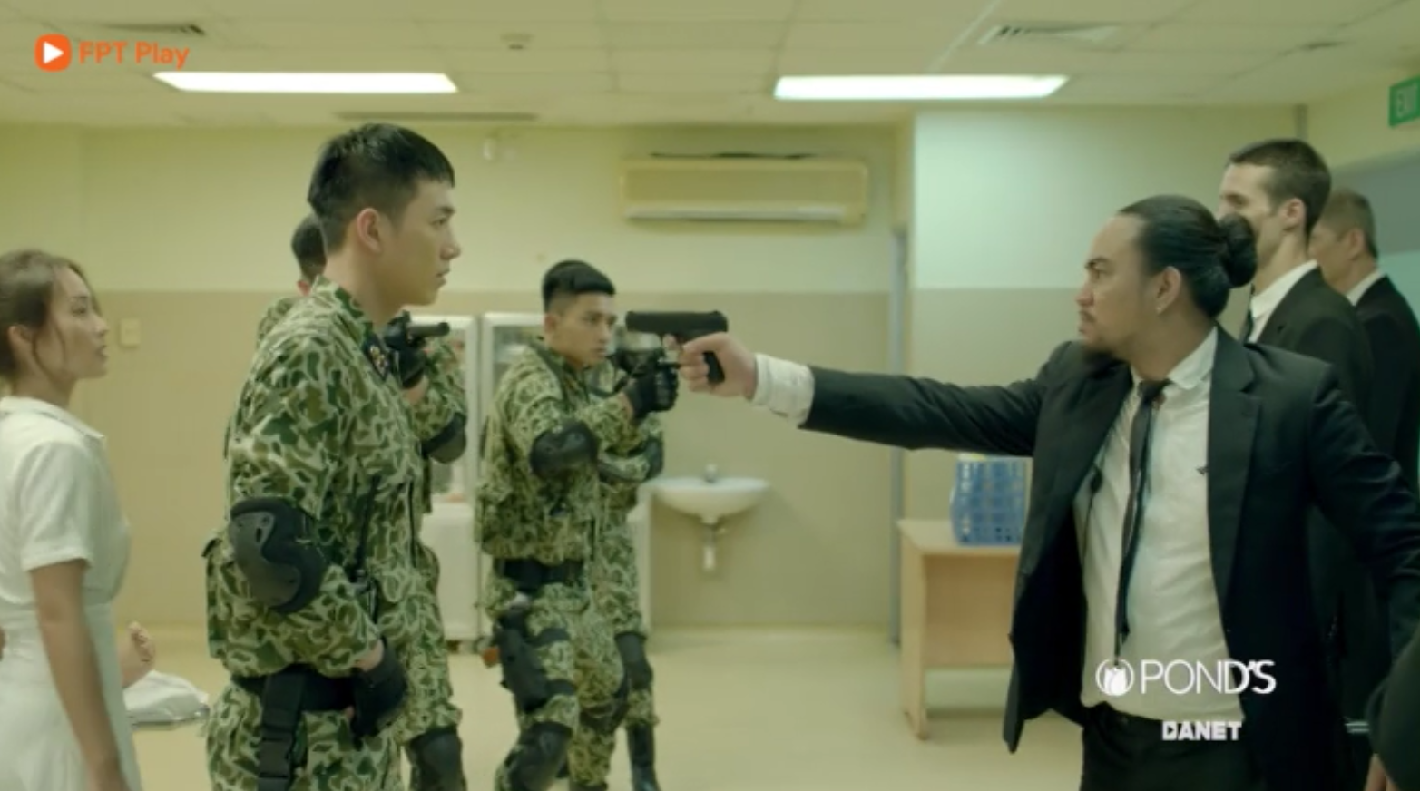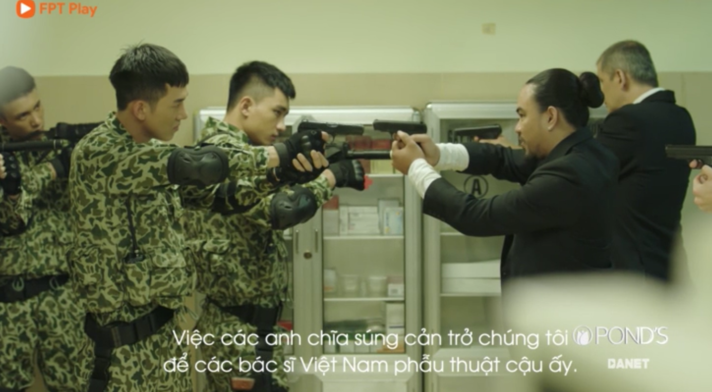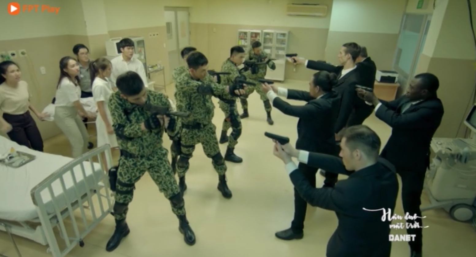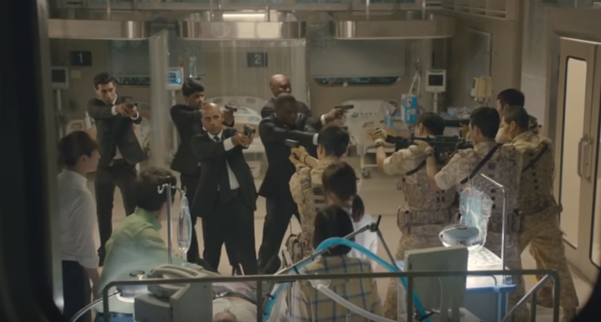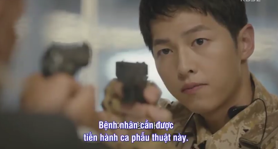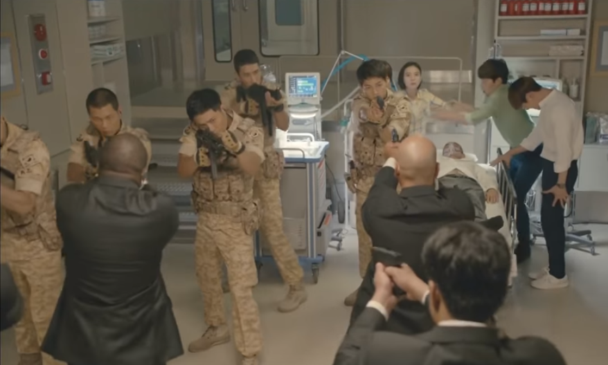 Cảnh đọ súng giữa trạm y tế của Yoo Shi Jin và quân sĩ nước bạn để làm phẫu thuật cứu sống ngài nghị sĩ.