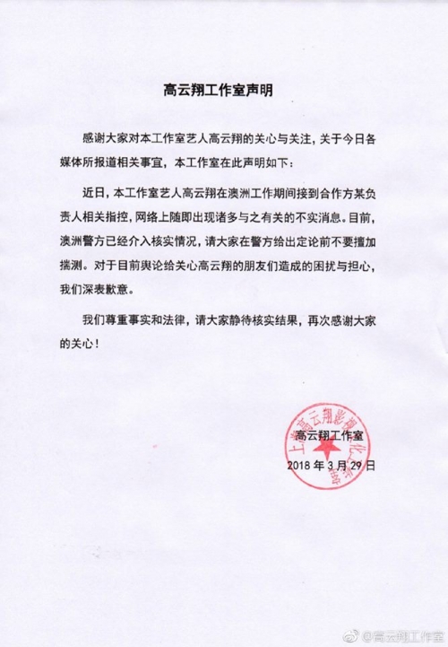 Ngày 29.3 phía công ty Cao Vân Tường đã lên tiếng thanh minh, biểu thị rằng “gần đây Cao Vân Tường đang hợp tác điều tra vụ án liên quan, cảnh sát Úc cũng đang bắt tay điều tra vụ việc”