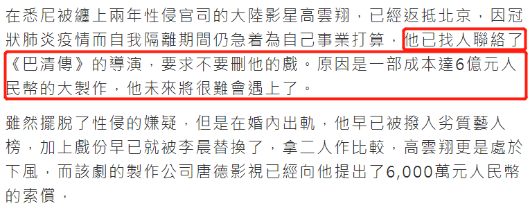 Tuy nhiên giữ lại Cao Vân Tường là một nước đi nguy hiểm, dư luận Trung Quốc không hề tha thứ cho “chồng cũ Đổng Tuyền”. Bên cạnh đó, nhà sản xuất Ba Thanh truyện - công ty Đường Đức đệ đơn khởi kiện, yêu cầu Cao Vân Tường phải bồi thường 60 triệu NDT (200 tỷ đồng) thế nên việc hòa hoãn giữa hai bên, giữ lại cảnh quay cho nam diễn viên là điều khó có thể xảy ra.