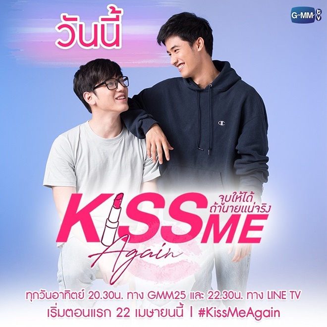 Đón xem Kiss Me Again - Hôn thì có gì khó được lên sóng vào 20h30 tối Chủ nhật hằng tuần trên kênh GMM25 (kênh Thái Lan).